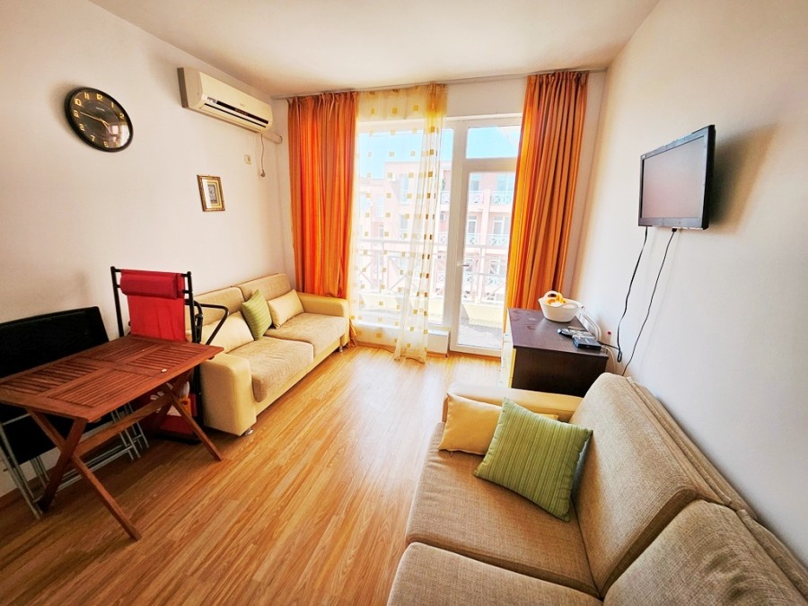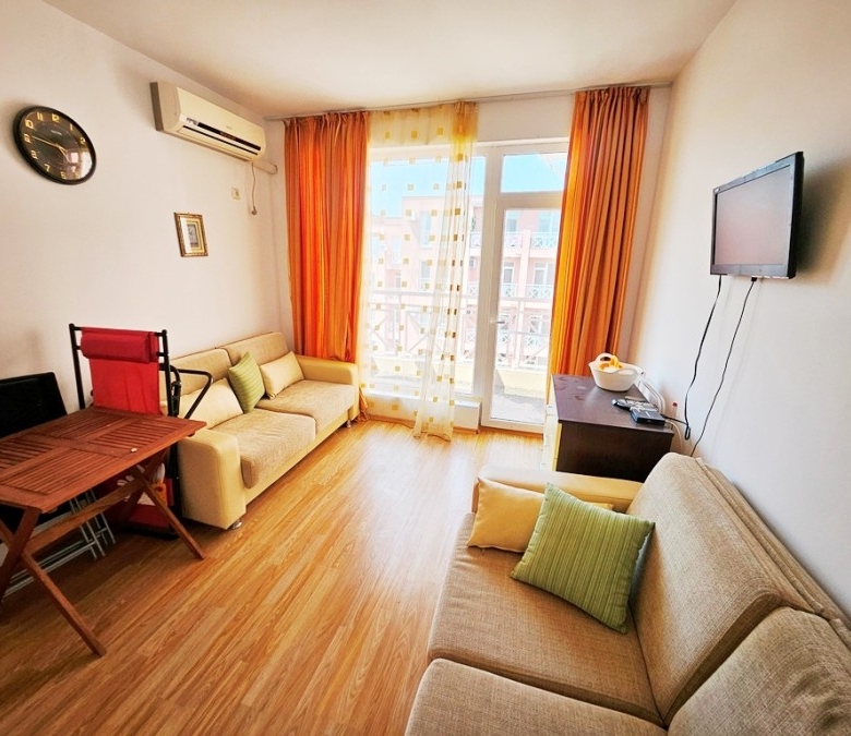 Top floor studio, 28 sq.m., with views to the pool, in Sunny Day 6, Sunny beach KC Properties is pleased to offer you this fully furnished studio with aview to the gardens of the complex. The property is situated in Sunny Day 6 – a residential complex situated in the outskirts of Sunny beach resort, within 3 km to the sea coast. Nessebar town is 7 km away and Bourgas airport – 35 km away. On site facilities include: 5 outdoor pools, tennis-courts, mini-golf fields, outdoor sport facilities, restaurant, supermarket, free parking area, security, reception, regular shuttle service in the summer season. The apartment is situated on the 4th- top floor (no lift) and has a total area of 28 sq.m. It comprises of: – Open-plan kitchen with lounge area; – one bedroom; – Shower-room/toilet; – balcony with views to the pool. Act 16. Separate accounts for water and electricity. The apartment is offered fully furnished and is in excellent condition. It is perfect vacation home, ideal for families with children and people who would like to enjoy peacefulness. Pet friendly area. Annual maintenance fee -580 EUR/year.