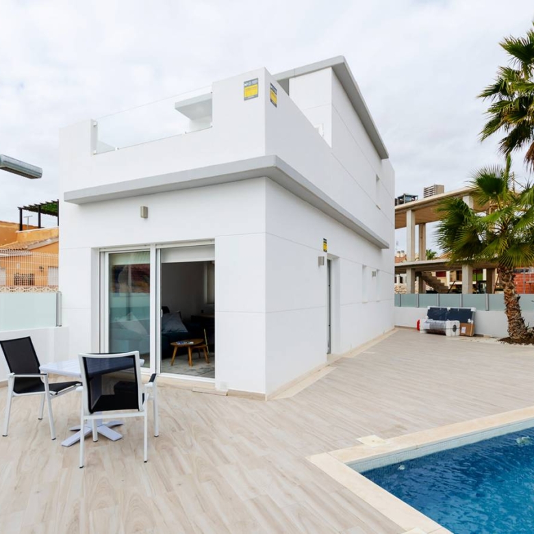 Villas for sale in Torrevieja, Costa Blanca, Spain New development of 7 independent properties, each with 3 bedrooms, 2 or 3 bathrooms, terraces and private swimming pool. *Optional solarium (consult price). The residential is located in the area of La Torreta Florida, with views to the Laguna Rosa and very close to all services (supermarkets, Habaneras Shopping Centre, school, high school, etc.). key ready 1 property! Property ID: GH-307709-D Price: €349,000 Property Size: 86 m2 Land Area: 135 m2 Bedrooms: 3 Bathrooms: 2 Property Type: Villa Property Status: For Sale