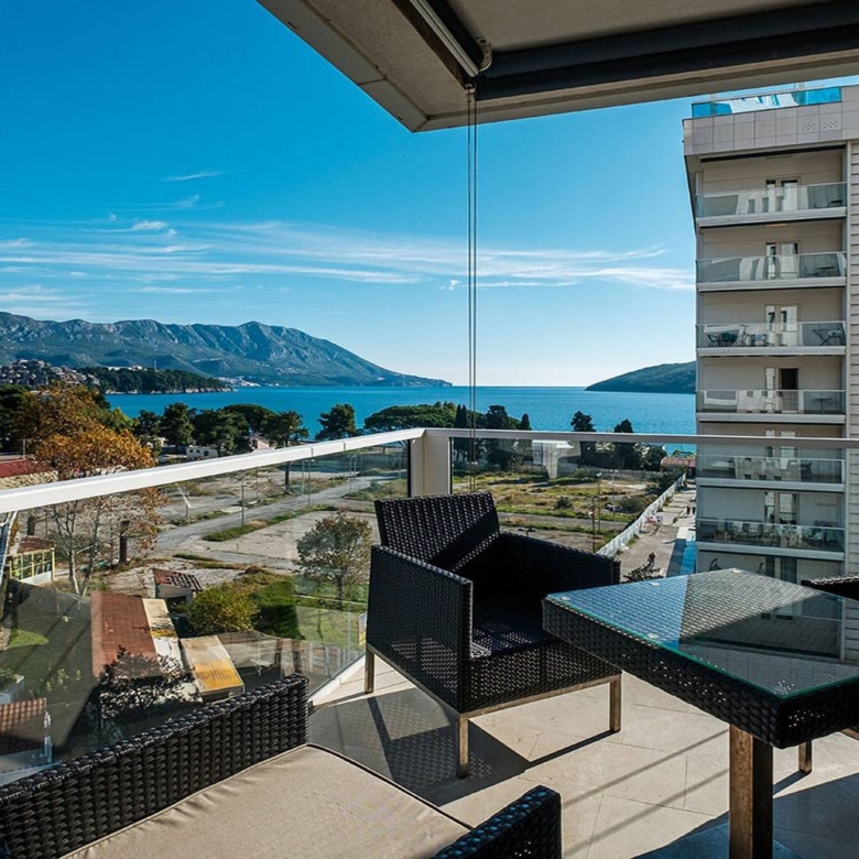 This beautiful two-bedroom apartment for sale is located in the heart of Budva, just 50 meters from the beautiful sandy beach and 200 meters from the Old Town and luxury marine yachts. “Tre Canne” residential building is a symbol of modern architecture and one of the major landmarks of Budva, with its three beautiful glass towers. With its medieval Old Town, sun-soaked beaches, and lively nightlife, Budva is the stand-out attraction along the Montenegrin coastline. The apartment with an area of 104m² is located on the 5th floor of the “Tre Canne” building. This spacious, comfortable apartment consists of a big living room, kitchen with dining place, two comfortable bedrooms, two bathrooms, and two large terraces where you can enjoy a fantastic panoramic view of the Adriatic Sea and the mountains. The apartment is fully equipped with furniture and appliances for a comfortable living or summer vacation. At the entrance to the apartment, there is a hallway with a large built-in wardrobe. There is a bathroom on the right and the kitchen immediately on the left. The kitchen is in one room together with the living room. The living room opens onto a smaller terrace. From the living room, there is another corridor that leads to the second bathroom on the left, one bedroom on the right, and straight from the hall to the second bedroom, from which there is a large terrace with a view of the sea and the mountains. An underground parking place with an elevator directly to the building is particularly convenient for the owners. “Tre Canne” complex has a variety of shops, restaurants, cafes, and beauty salons, so you can easily find everything you need for everyday life just “around the corner.” Well positioned, this apartment is only 24km away from Tivat international airport and 68km from the airport in Podgorica, the capital of Montenegro. Please feel free to contact us for more information if you are interested in this beautiful seafront two-bedroom apartment.