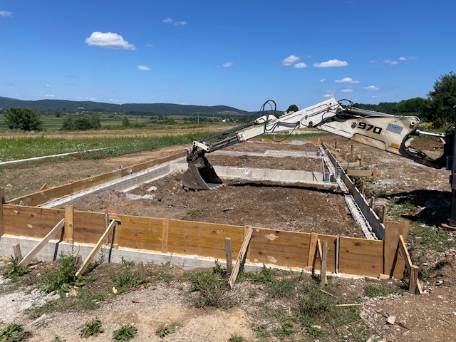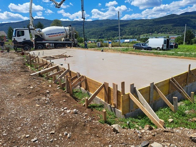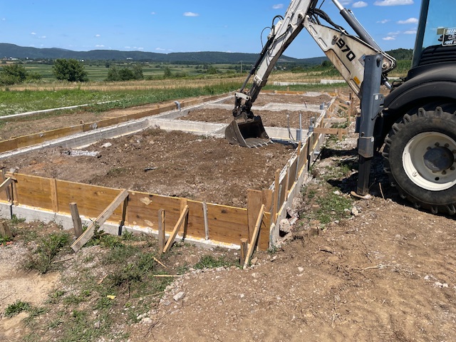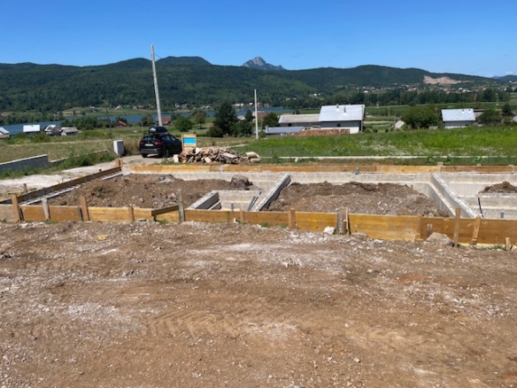 The properties are being built on a sloped plot that has been expertly cleared and leveled. A reinforced concrete retaining wall has already been constructed along the western side, with the structure also serving as a base for a future low-profile fence on other borders, giving the site a clean, tiered, and protected aesthetic. Access has been secured with a private access road of approximately 50 meters already built, along with two dedicated parking spaces and fully completed water and electricity connections.