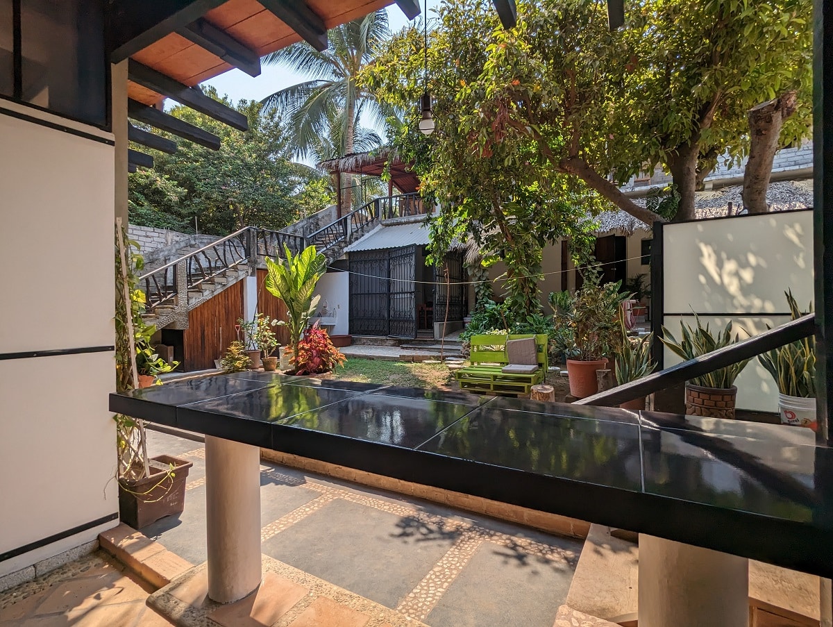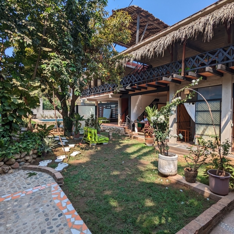 The versatile layout includes 2 private studios with en-suite bathrooms and 2 apartments (each with 2 bedrooms, a kitchen, and a shared bathroom), creating multiple revenue streams. Expansive terraces — 114 m2 west terrace, 61 m2 east terrace, and 88 m2 central terrace — provide abundant space for outdoor entertaining or relaxation while enjoying the tropical atmosphere. The property also features parking for two cars and essential utilities, including water and electricity.