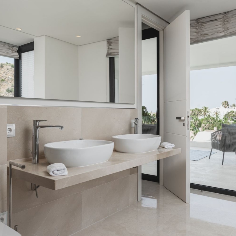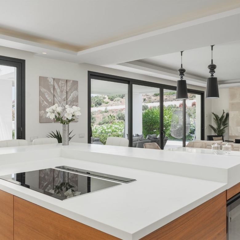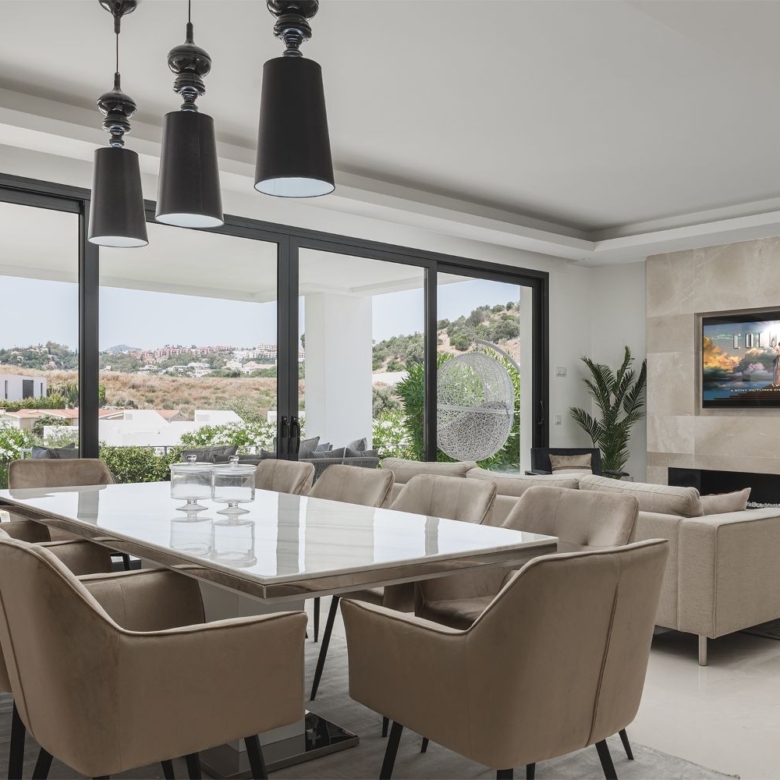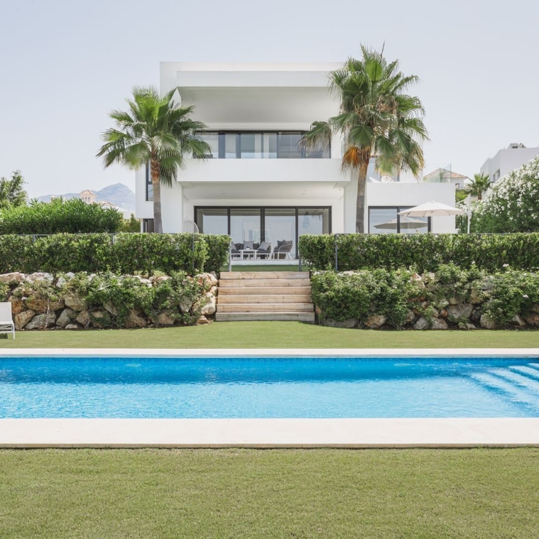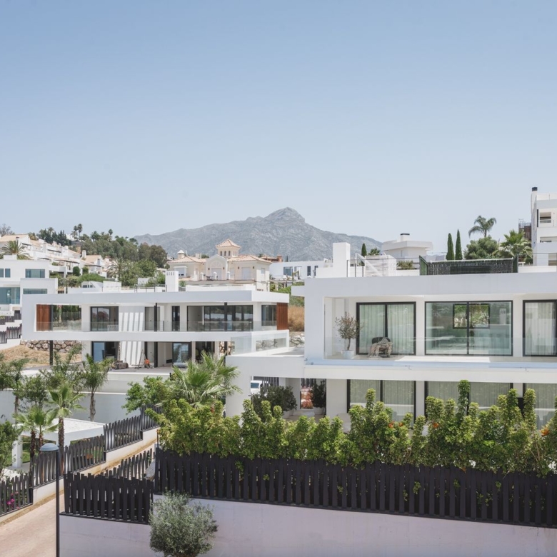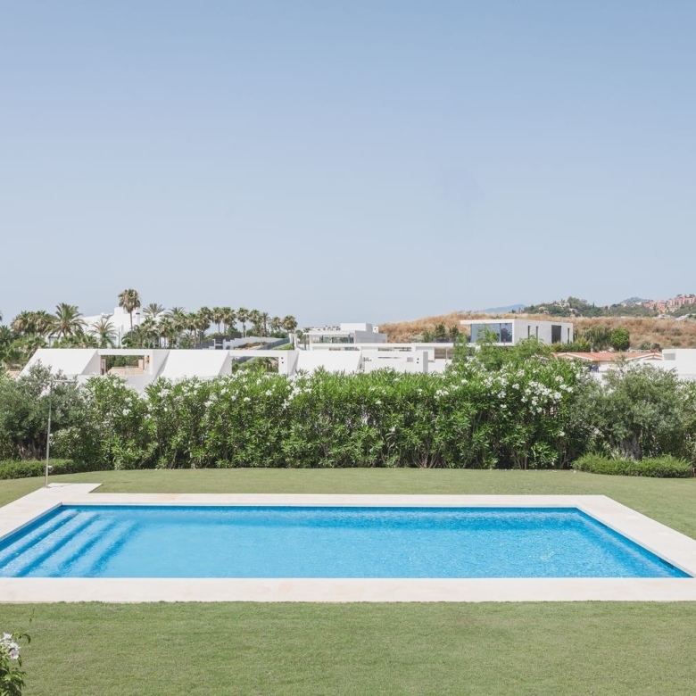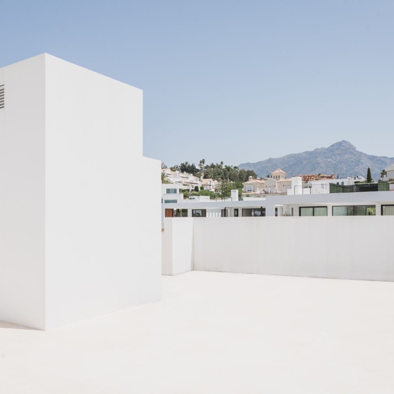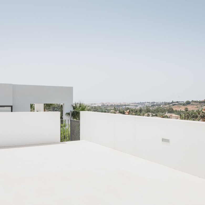 Brand-new contemporary luxury villa in a prestigious location in the famous Golf Valley, with the spectacular backdrop of Marbella’s iconic La Concha Mountain. Recently built to top specifications and finishes, this 5-bedroom villa pays special attention to the Andalusian climate, with plenty of outside seating areas carefully shaded and perfect for relaxing. Distributed on three levels plus rooftop solarium, it comprises, on the main floor: spacious living room with several seating areas; open-plan fully fitted kitchen/dining area equipped with top appliances and with a central island and wine cooler; 2 en-suite guest bedrooms; access to the porches, terraces, swimming pool and the carefully landscaped garden with mature plants that surround the property create privacy from nearby homes. Upstairs: two guest en-suite bedrooms with fabulous views over the Golf Valley, one of them with access to a private terrace; stunning master suite with dressing room and access to a private terrace also enjoying the amazing views. Lower level: garage for 3 cars; utility room; laundry room; storage room; guest toilet. Special features include underfloor heating in the bathrooms, domotic and music system throughout. Just minutes away from several international schools, gastronomic experiences and amenities, this magnificent corner villa is set within a quiet gated complex with 24-hour security, guaranteeing a total privacy.
