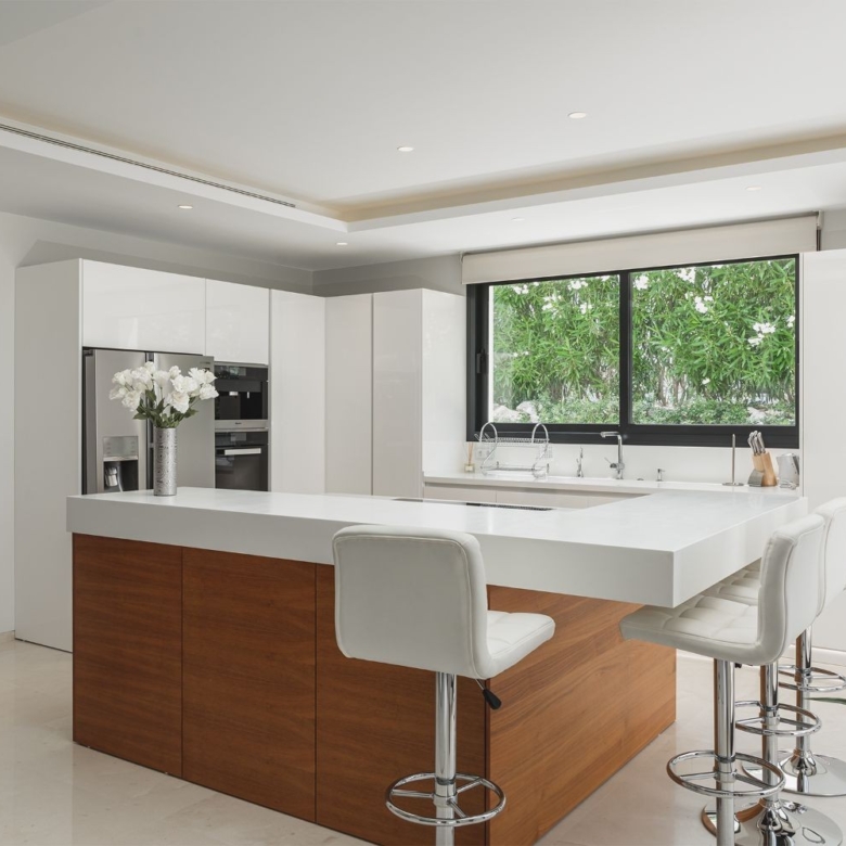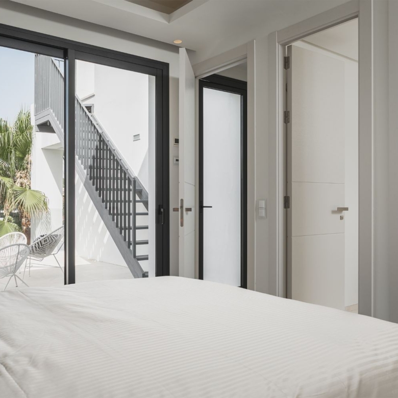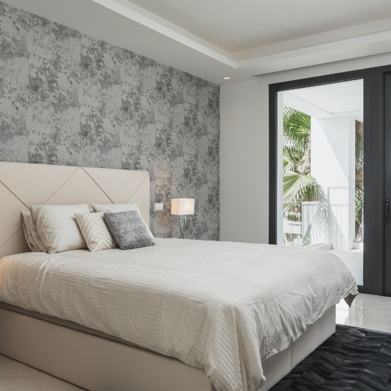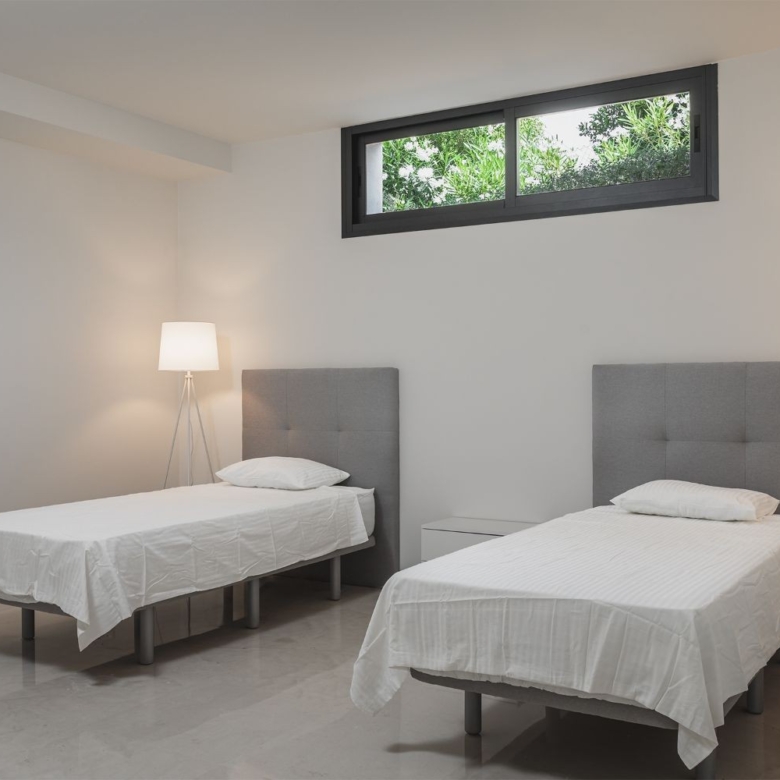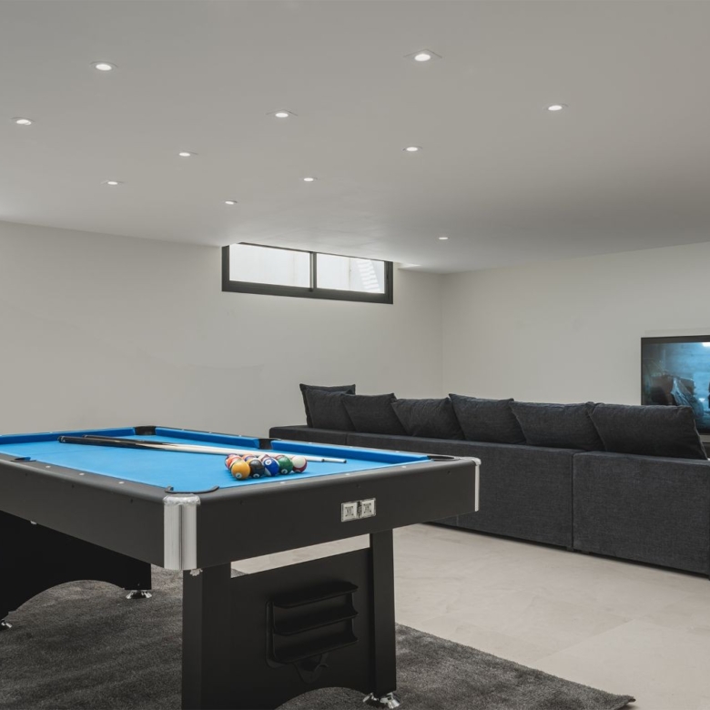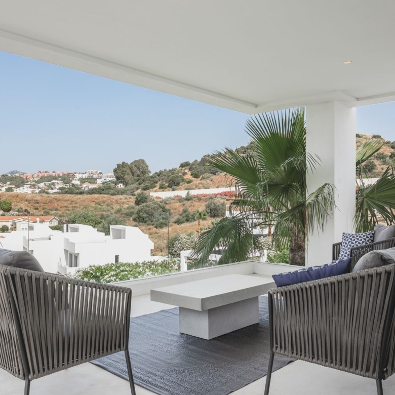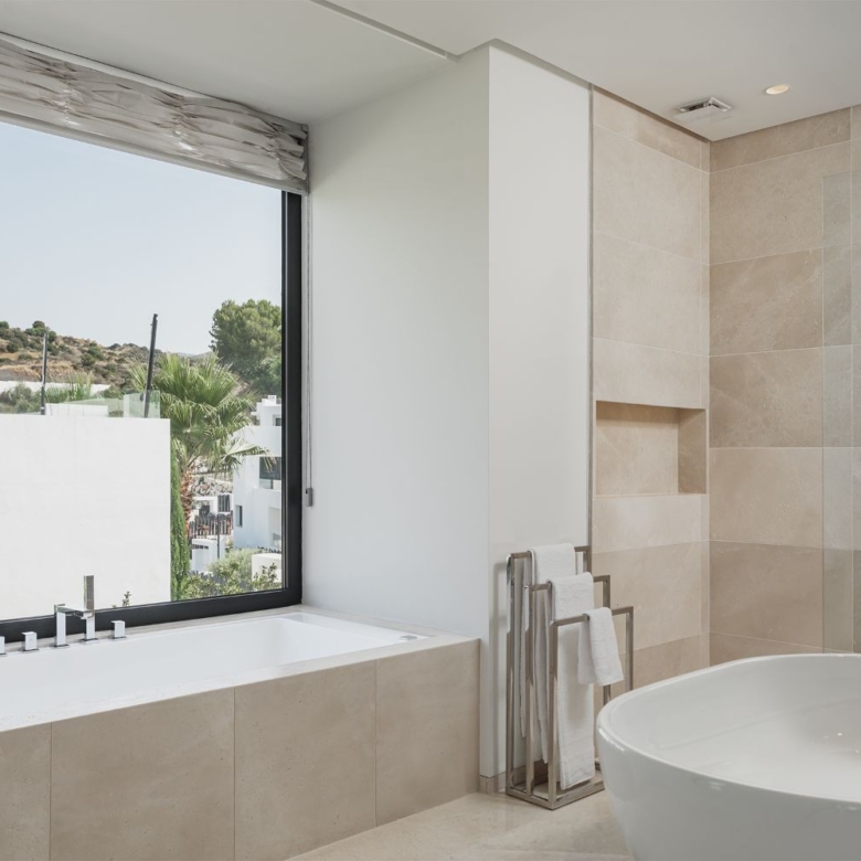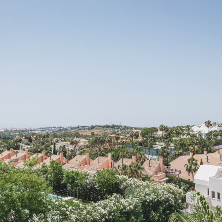 Brand-new contemporary luxury villa in a prestigious location in the famous Golf Valley, with the spectacular backdrop of Marbella’s iconic La Concha Mountain. Recently built to top specifications and finishes, this 5-bedroom villa pays special attention to the Andalusian climate, with plenty of outside seating areas carefully shaded and perfect for relaxing. Distributed on three levels plus rooftop solarium, it comprises, on the main floor: spacious living room with several seating areas; open-plan fully fitted kitchen/dining area equipped with top appliances and with a central island and wine cooler; 2 en-suite guest bedrooms; access to the porches, terraces, swimming pool and the carefully landscaped garden with mature plants that surround the property create privacy from nearby homes. Upstairs: two guest en-suite bedrooms with fabulous views over the Golf Valley, one of them with access to a private terrace; stunning master suite with dressing room and access to a private terrace also enjoying the amazing views. Lower level: garage for 3 cars; utility room; laundry room; storage room; guest toilet. Special features include underfloor heating in the bathrooms, domotic and music system throughout. Just minutes away from several international schools, gastronomic experiences and amenities, this magnificent corner villa is set within a quiet gated complex with 24-hour security, guaranteeing a total privacy.