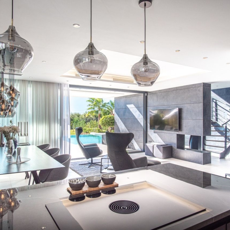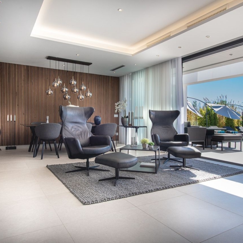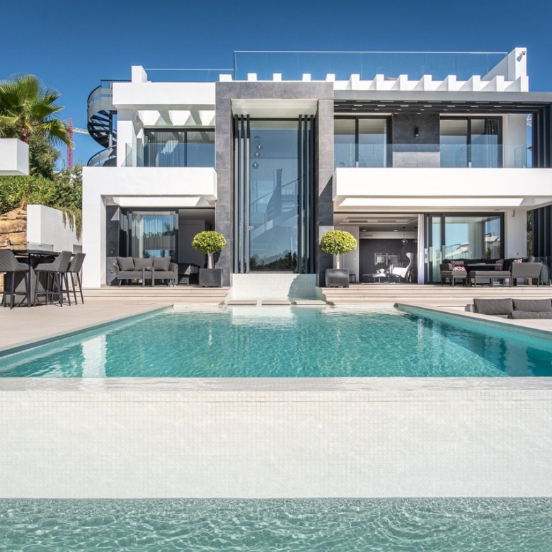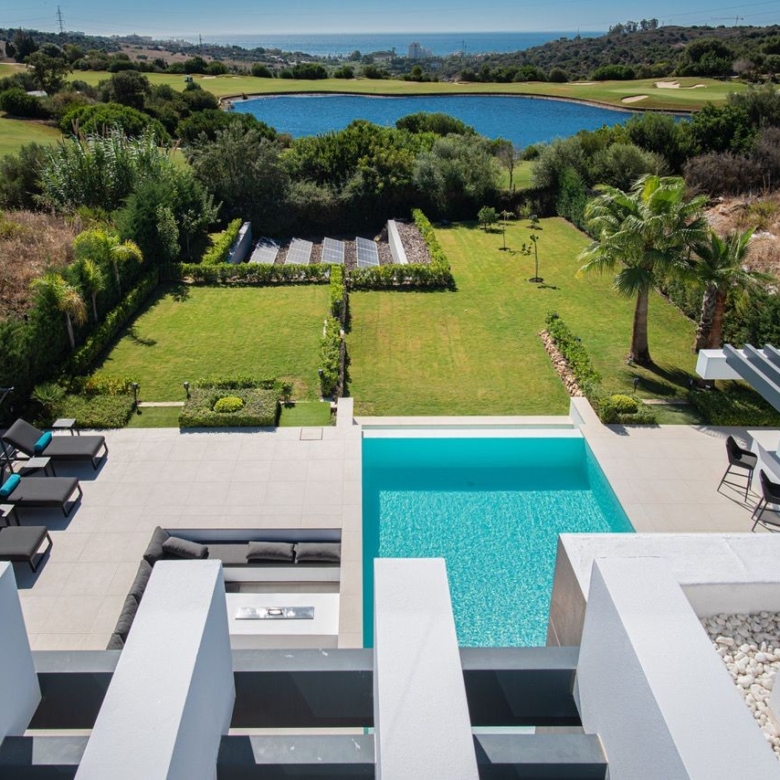 Located on a private and tranquil street front line to the golf course of Valle Romano, Villa 17 is a stunning modern masterpiece that exudes beauty and serenity, boasting panoramic sea golf and mountain views and only minutes from the ever talked about town of Estepona . Within this prestigious location you are within a short distance to the beachfront, enjoying the fantastic outdoor lifestyle and entertainment Estepona has to offer. This 6 bedroom, 5 bathroom home sits on a plot of over 1000m2 with over 383m2 of liveable space plus solarium and terracing, walking in through the impressive front door opens you up to a spacious and bright living room area with a beautiful interior bespoke design and floor to ceiling windows which allow plenty of natural light to shine through. Boasting of a generous terrace with sunken lounge and fire pit complete with pool and Outdoor kitchen which includes a gas BBQ and hot/cold tap dining area, this setting overlooks the views towards the Mediterranean sea over the gold course. Upstairs a sophisticated master suite opens to a terrace with gorgeous views. An impressive basement level includes plenty of entertaining features such as a TV area, wine bodega and cinema room. The villa has been designed to be as cost efficient as possible and utilise a state of the art demotic system for interior lights (excluding bathroom), exterior and interior lights, Air condition solar panel, Heat pump for swimming pool, intercom and alarm which is all power by a 16 double panel Photovoltaic solar panel system which powered by an app allowing you to monitor consumption and feed any excess into your own power bank. Each detail has been carefully considered, giving this villa the perfect blend of style and sophistication, ready to impress the most discerning buyer.
