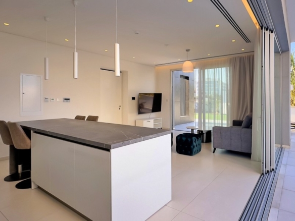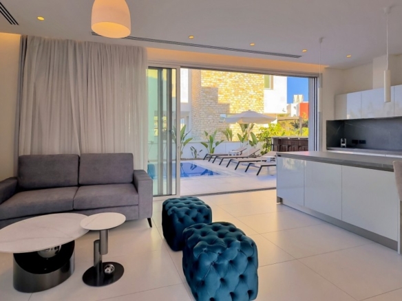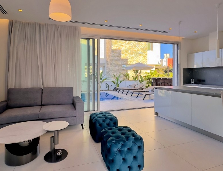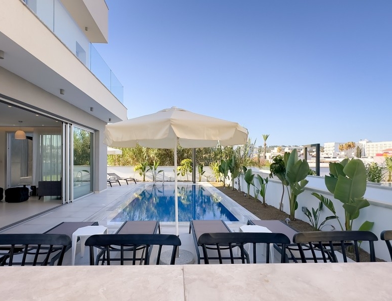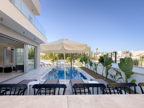 This centrally located villa in Ayia Napa offers the perfect blend of excitement and tranquility. Situated in a gated complex of just eight villas, it provides privacy and exclusivity. You’ll enjoy easy access to a sandy Blue Flag beach and various amenities within walking distance. The villa features high-end interior and exterior finishes that beautifully balance elegance and functionality. The layout includes leisure space on the lower level, living areas and a modern kitchen on the ground floor, and 3 large bedrooms on the first floor. The villa also boasts a private pool, a BBQ area, and a roof garden with a jacuzzi, perfect for entertaining under the stars. Fully furnished with modern appliances, this villa is designed for comfort and convenience, making it an ideal home or a prosperous investment.