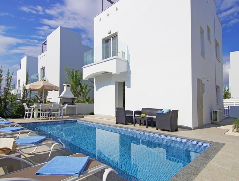 These villas are more than just a project, they provide a lifestyle that speaks luxury, refinement, elegance,opulence and all the finest benefits that coastal living offers. The design and layout of the villas are second to none. Each villa offers a modern kitchen, spacious living and dining area and easy, convenient access to a private swimming pool and patio area. Located just steps away from one of the island’s best beach, ‘Nissi Beach’!