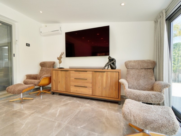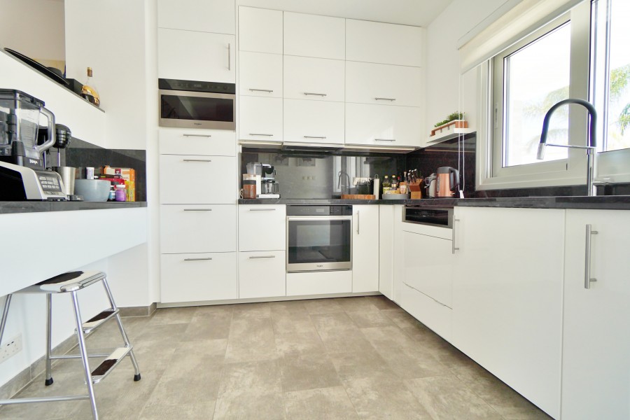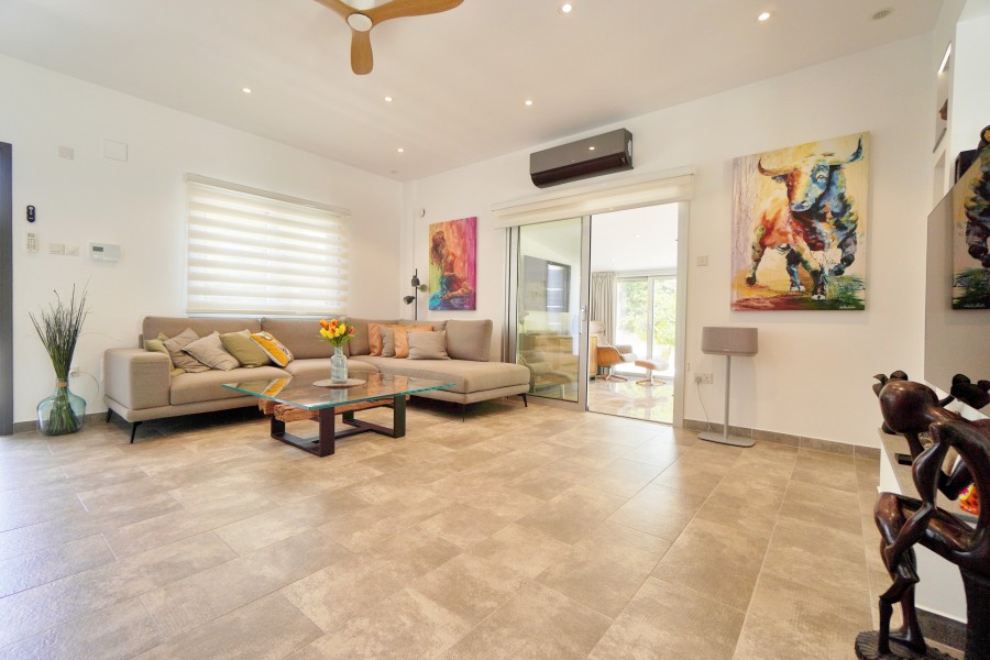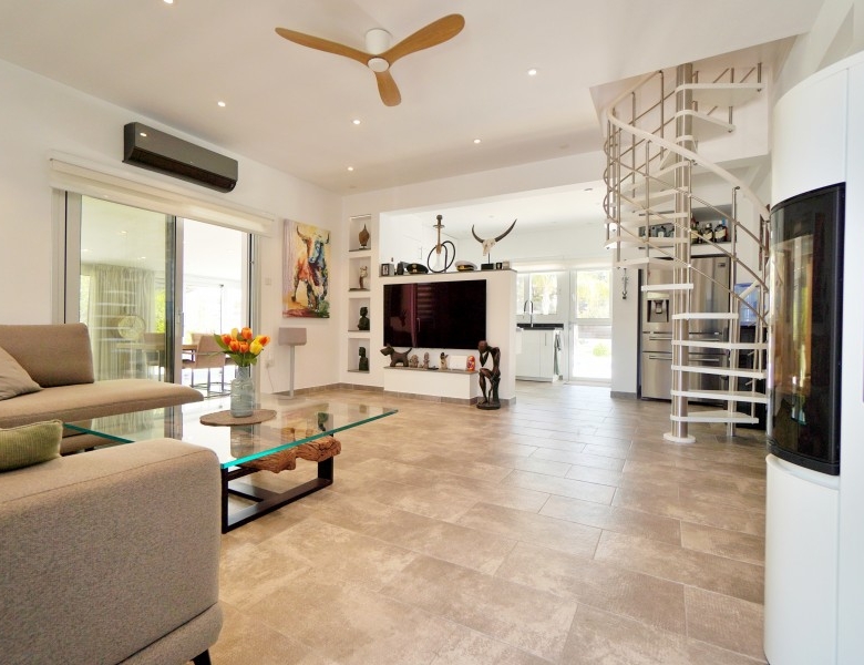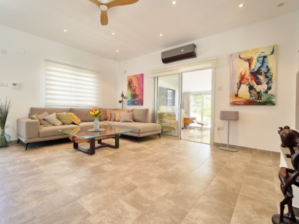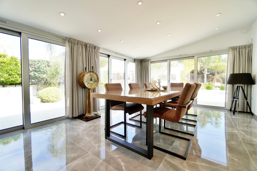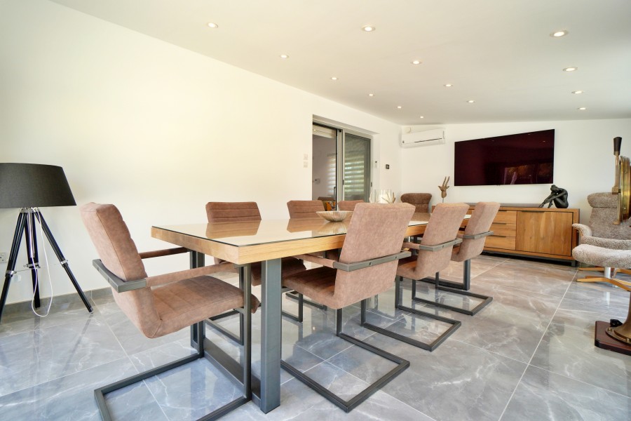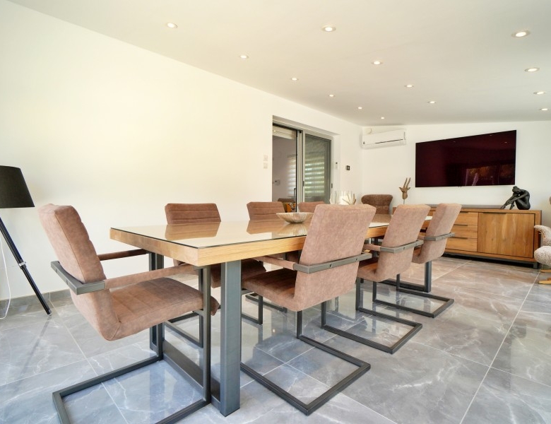 This phenomenal 4-bedroom bungalow is a fully renovated, modern family home located in the heart of Ayia Thekla, just 5 minutes from the beach and a short drive to the new marina and Nissi Beach. Set on a large corner plot in a quiet residential area, the property features a private swimming pool with water feature, a modern annex, and a beautifully landscaped garden with multiple seating and dining areas, both sunny and shaded. Renovated in 2020, the insulated home boasts a spacious open-plan living area with thermal double-glazed windows, a log burner, and a bright dining extension with panoramic garden views. The sleek kitchen includes a breakfast bar and new high-quality appliances, while all four double bedrooms have fitted wardrobes and stylish suspended ceilings with spotlights. One bedroom is accessed via a unique spiral staircase, and the master opens directly onto the terrace. Additional features include underfloor heating, photovoltaic solar panels, new air conditioning units, USB sockets, an alarm system with eight cameras, and covered parking. The annex offers extra space for guests or a home office, complete with an outdoor WC. The property is offered unfurnished but includes all appliances and garden furniture, making it an ideal family residence or investment opportunity for holiday rentals.