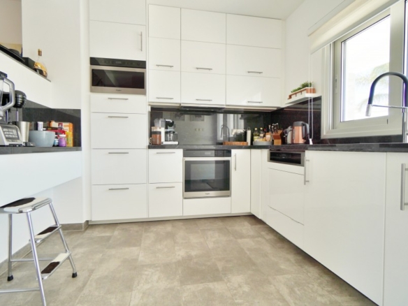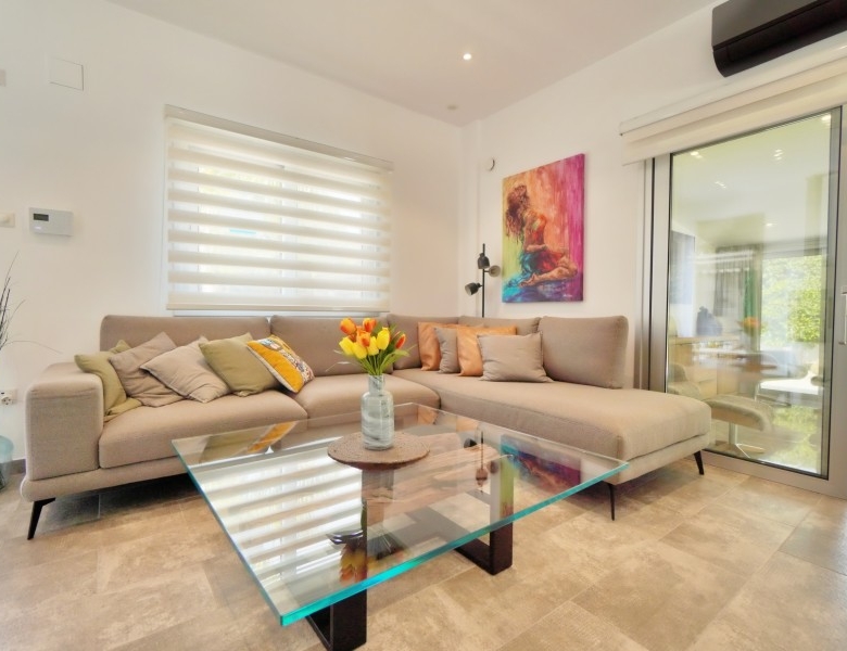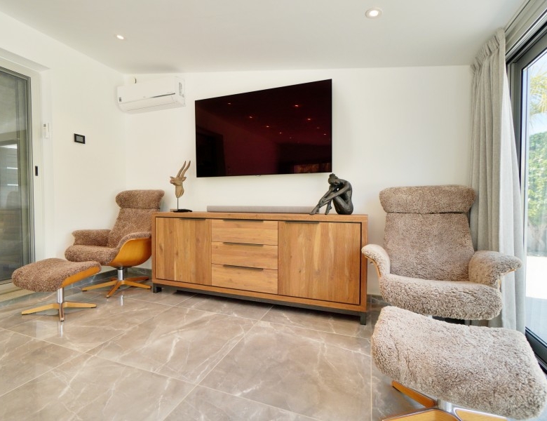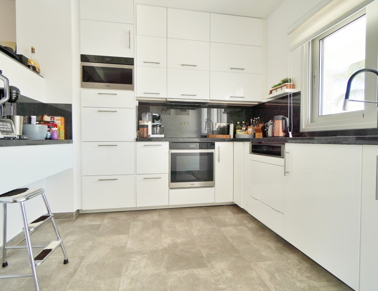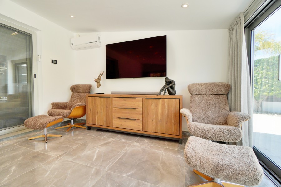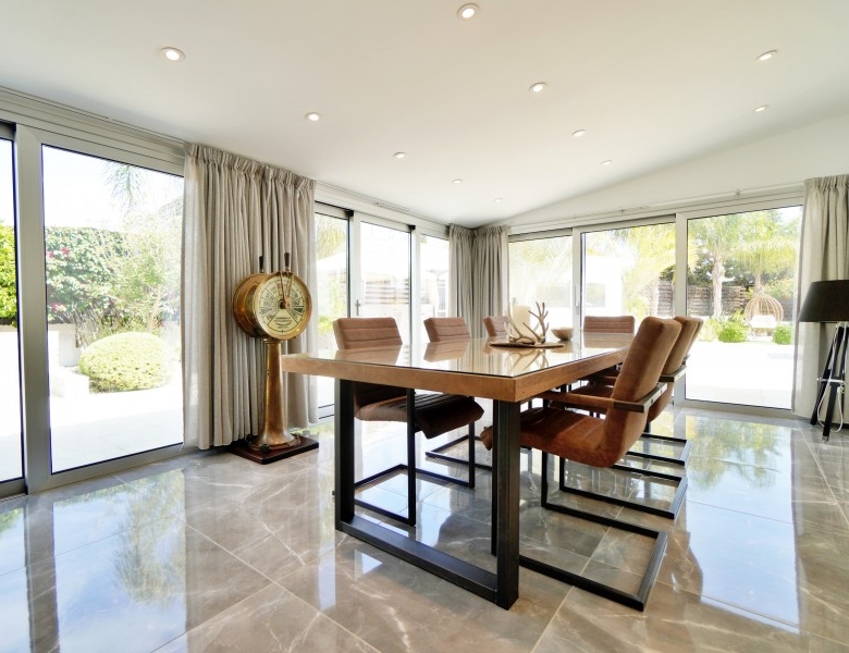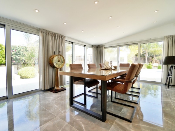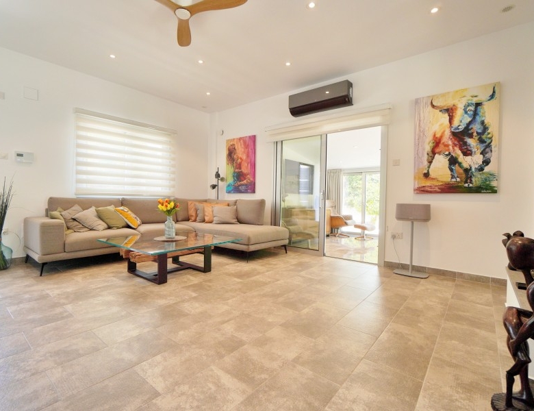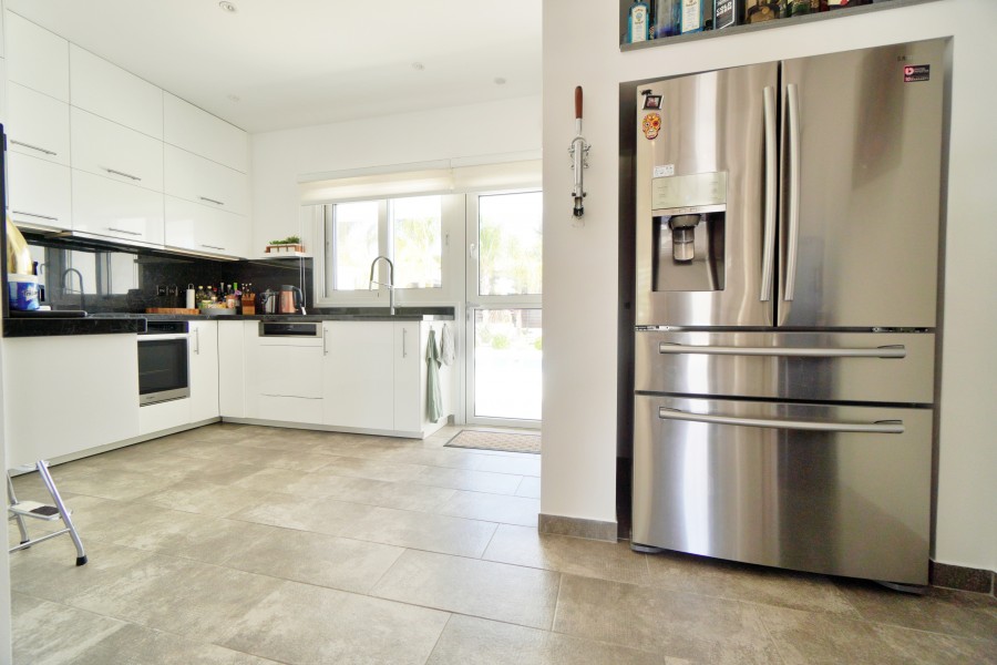 This phenomenal 4-bedroom bungalow is a fully renovated, modern family home located in the heart of Ayia Thekla, just 5 minutes from the beach and a short drive to the new marina and Nissi Beach. Set on a large corner plot in a quiet residential area, the property features a private swimming pool with water feature, a modern annex, and a beautifully landscaped garden with multiple seating and dining areas, both sunny and shaded. Renovated in 2020, the insulated home boasts a spacious open-plan living area with thermal double-glazed windows, a log burner, and a bright dining extension with panoramic garden views. The sleek kitchen includes a breakfast bar and new high-quality appliances, while all four double bedrooms have fitted wardrobes and stylish suspended ceilings with spotlights. One bedroom is accessed via a unique spiral staircase, and the master opens directly onto the terrace. Additional features include underfloor heating, photovoltaic solar panels, new air conditioning units, USB sockets, an alarm system with eight cameras, and covered parking. The annex offers extra space for guests or a home office, complete with an outdoor WC. The property is offered unfurnished but includes all appliances and garden furniture, making it an ideal family residence or investment opportunity for holiday rentals.