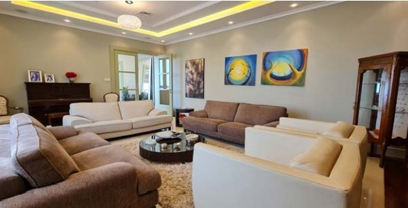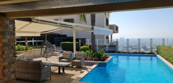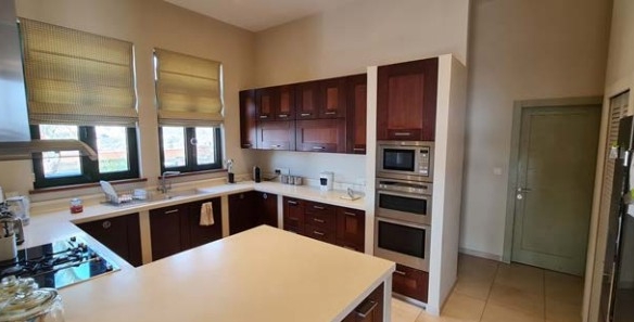 Magnificent 5 bedroom house is of a postmodern signature architectural style, with real luxury level finishes and a total covered areas of 750 sq.m., consisting of the following facilities. Main bedroom bathroom with double Jacuzzi, walk in shower, toilet room. 2 large Living room areas with a big traditional marble fireplace and high ceilings. 1 office with built in library shelves, large playroom/cinema room. Large gym area with a storage room. Covered garage with a remote control door for 3 cars. A Beautiful garden with a large swimming pool. Large covered barbeque area with fridge, sink, storage, dining table for 12 people.