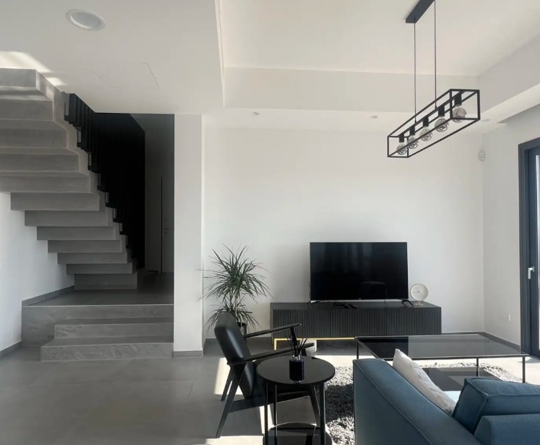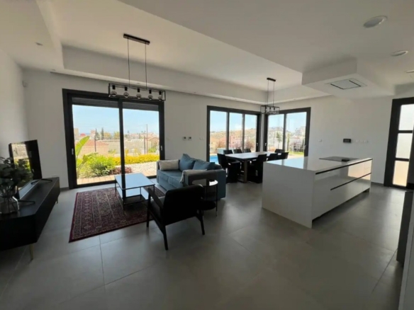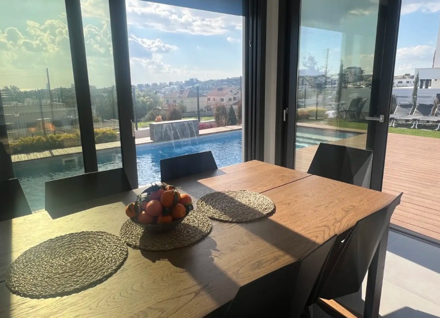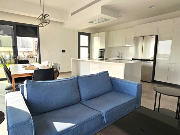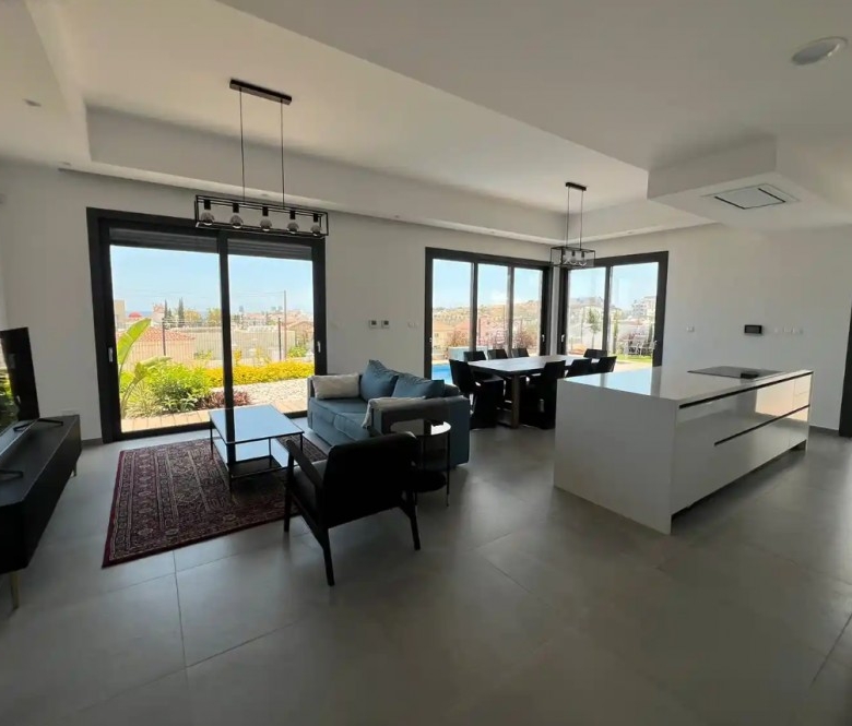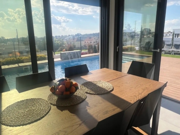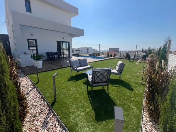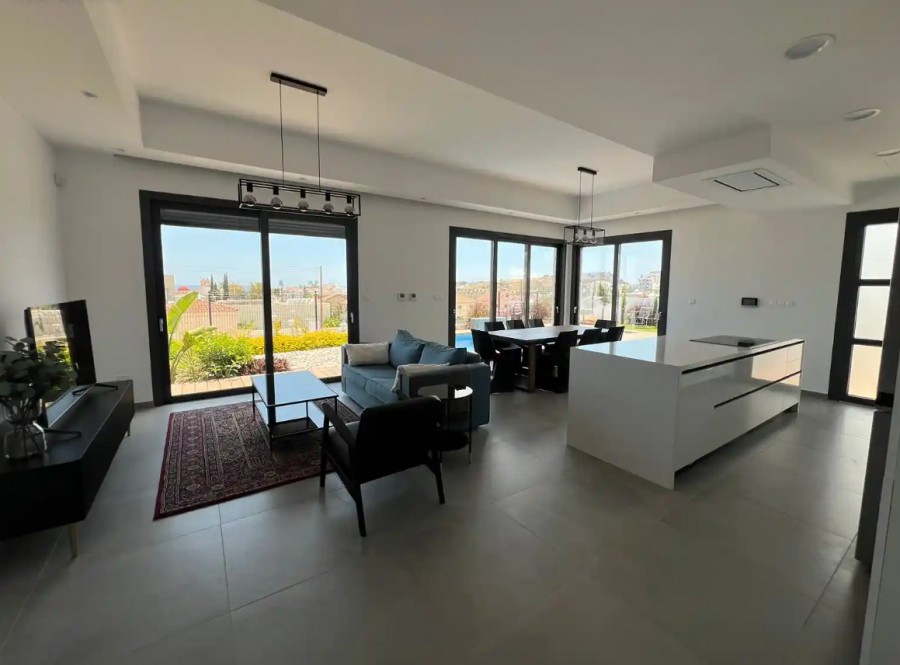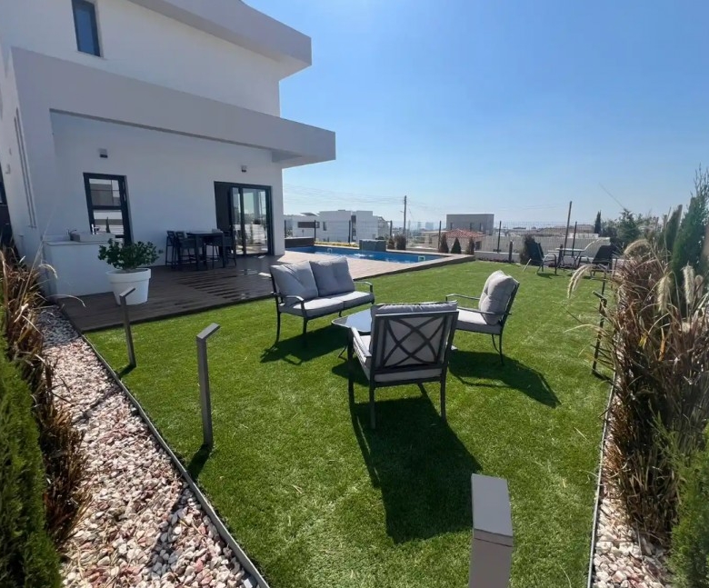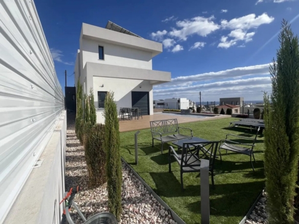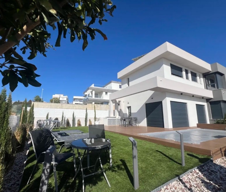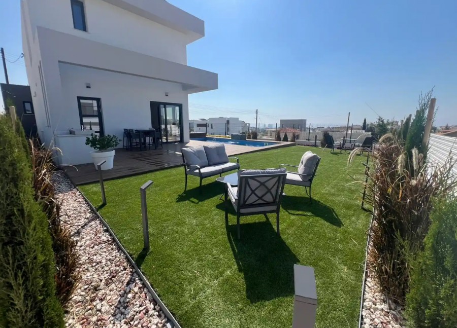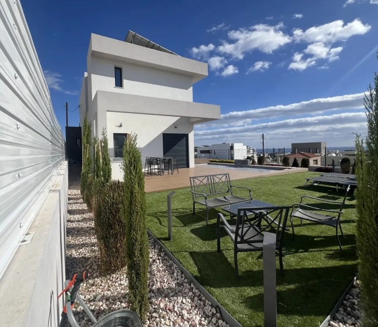 The property sits on a 433 sqm plot with a covered area of 200 sqm next to a large green area, which offers stunning sea views. The house has four bedrooms, three situated on the first floor, and one on the ground floor, each with its en-suite bathroom, featuring top-quality Laufen Sanitary ware and glass shower cabinets from Epiphaniou. The master bedroom has a free-standing bath and a separate shower, as well as a walk-in wardrobe. The house benefits from underfloor heating, raised ceilings, hidden Mitsubishi A/C units in the lounge and kitchen area, split A/C units in the bedrooms, hidden curtain rails, and aluminum windows with rolling shutters. The private pool with water curtain feature will be surrounded by decking and a decked veranda of approximately 40 sqm. Additionally, there is a large garden, double garage, and a built barbecue area with sink and power sockets. Woodwork comprises of top-quality Italian kitchen, utility room, wardrobes, and internal doors all from Cuccina. There are three top-quality water filtration systems from Karma Water, including a water softener system for the whole house. Additional features include a 7 kW solar system, LED strip lighting around the house, a security entrance door, external HPL cladding by Marios Chari, security cameras, and an alarm system.
