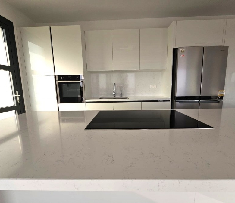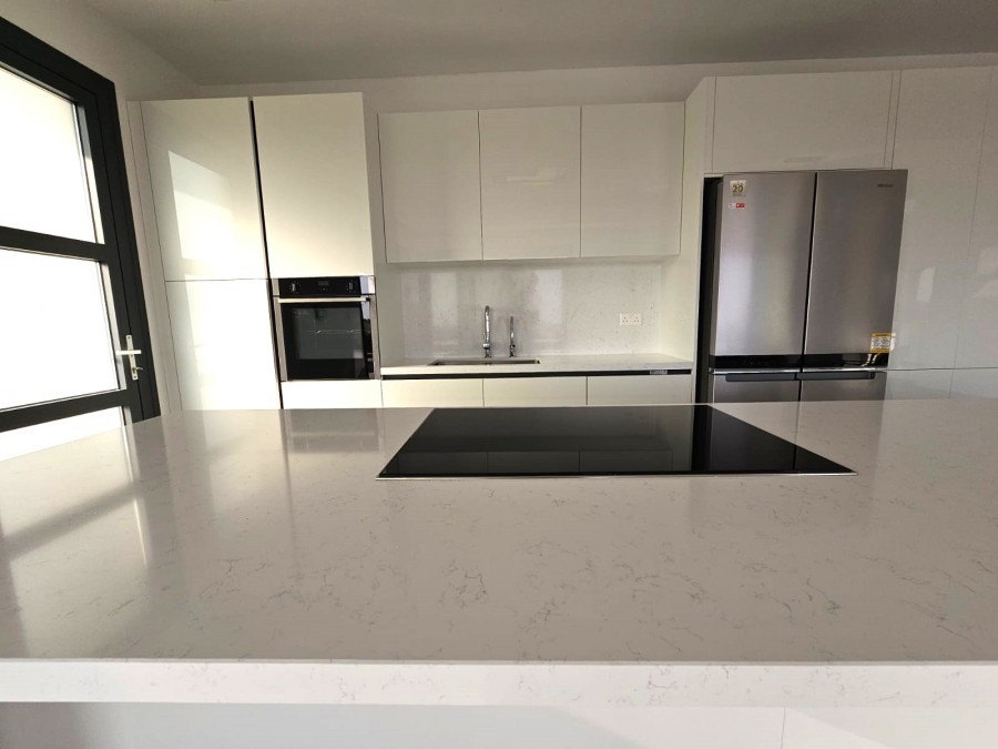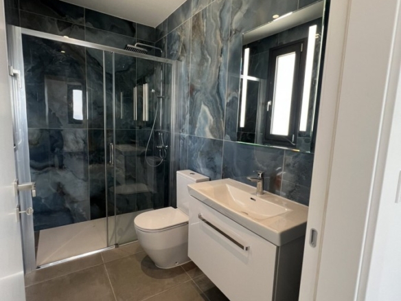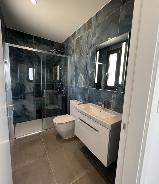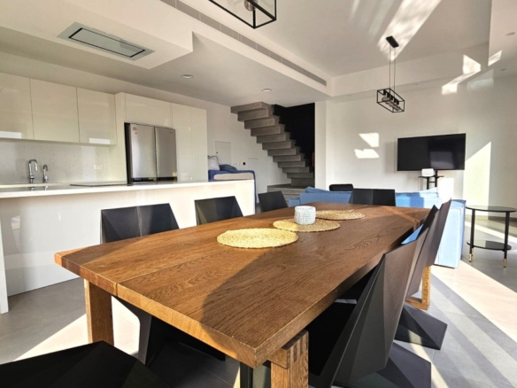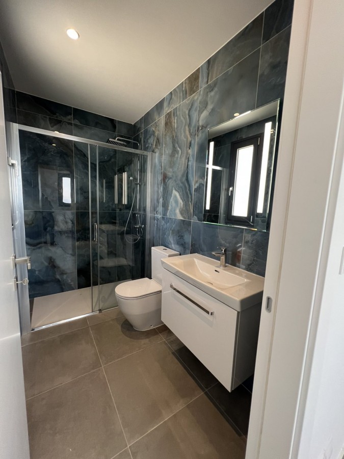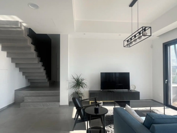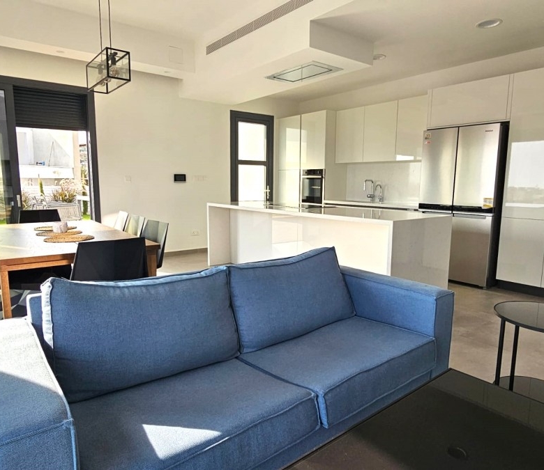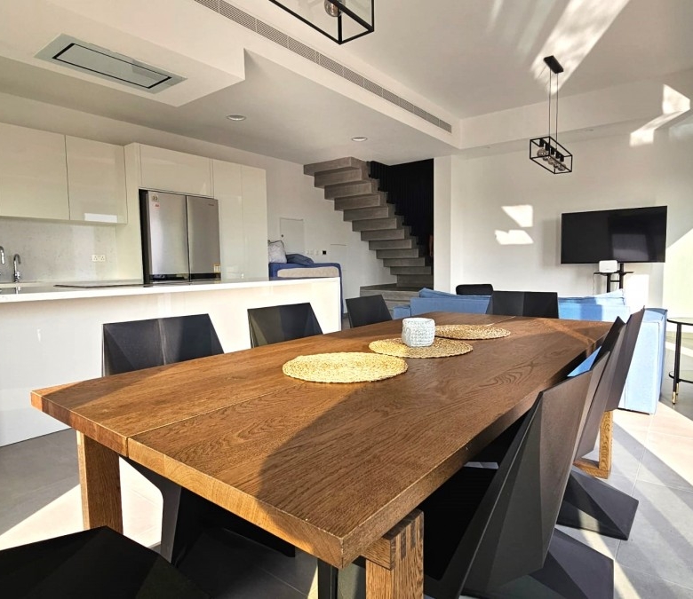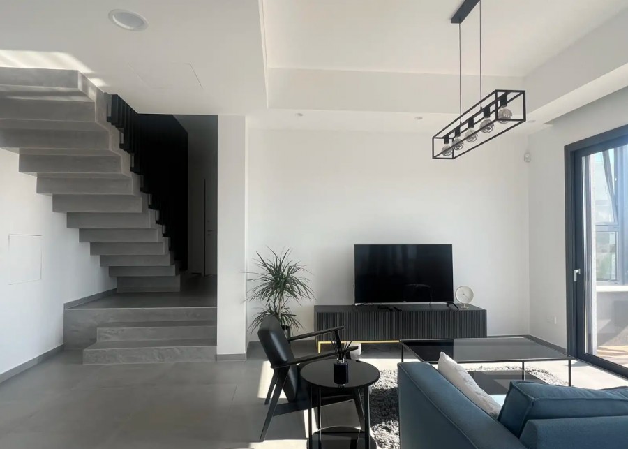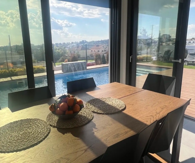 The property sits on a 433 sqm plot with a covered area of 200 sqm next to a large green area, which offers stunning sea views. The house has four bedrooms, three situated on the first floor, and one on the ground floor, each with its en-suite bathroom, featuring top-quality Laufen Sanitary ware and glass shower cabinets from Epiphaniou. The master bedroom has a free-standing bath and a separate shower, as well as a walk-in wardrobe. The house benefits from underfloor heating, raised ceilings, hidden Mitsubishi A/C units in the lounge and kitchen area, split A/C units in the bedrooms, hidden curtain rails, and aluminum windows with rolling shutters. The private pool with water curtain feature will be surrounded by decking and a decked veranda of approximately 40 sqm. Additionally, there is a large garden, double garage, and a built barbecue area with sink and power sockets. Woodwork comprises of top-quality Italian kitchen, utility room, wardrobes, and internal doors all from Cuccina. There are three top-quality water filtration systems from Karma Water, including a water softener system for the whole house. Additional features include a 7 kW solar system, LED strip lighting around the house, a security entrance door, external HPL cladding by Marios Chari, security cameras, and an alarm system.