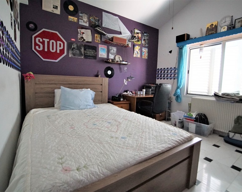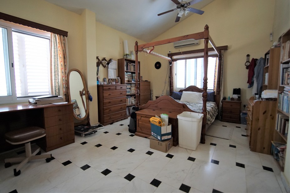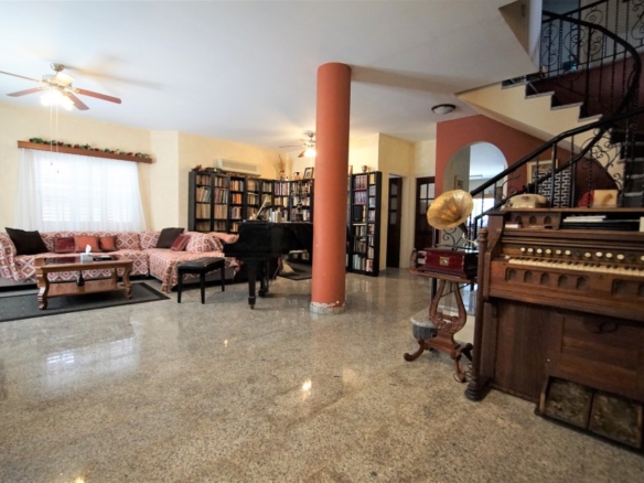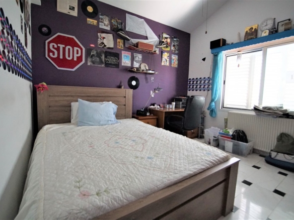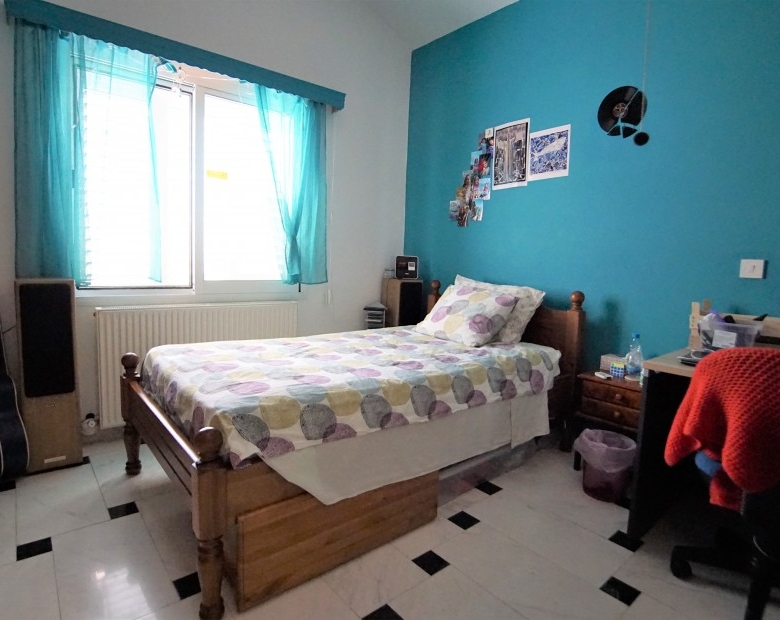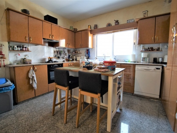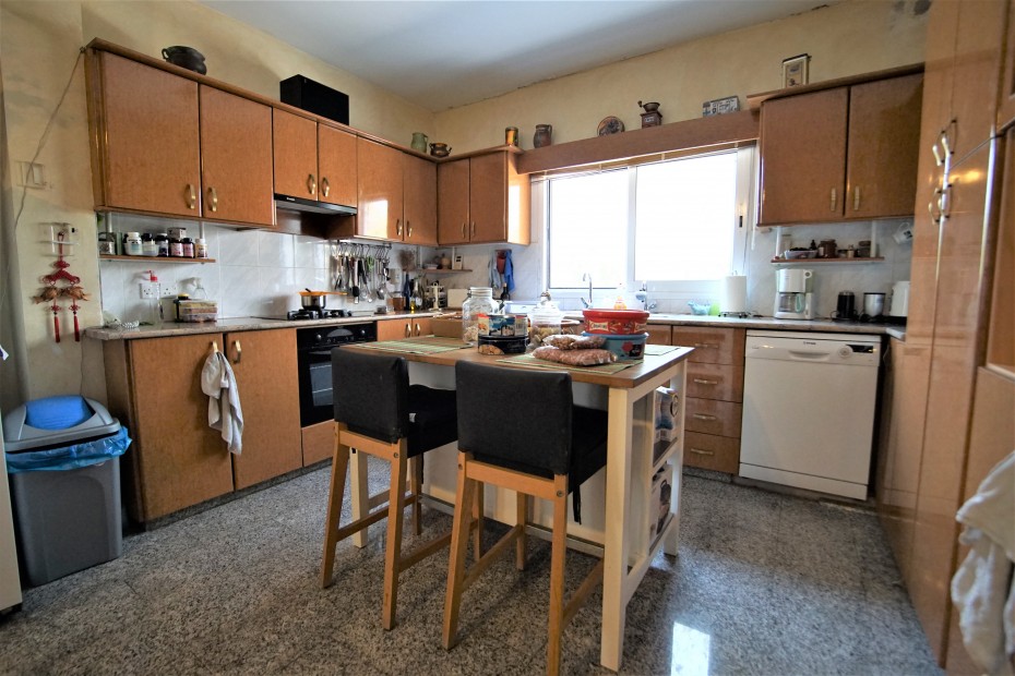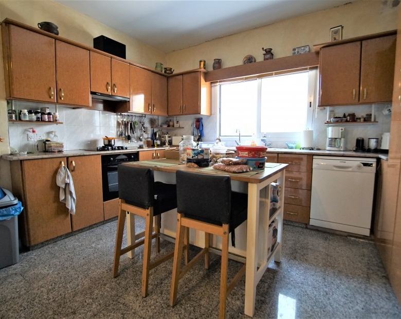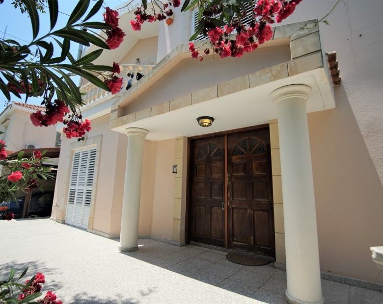 A spacious 5 bedroom detached house for sale in Agios Athanasios, Limassol. It is located in a quiet residential area not far off the highway with a community park nearby. You can find all amenities just a short drive away such as bank, school, kiosks and cafes. The house offers photovoltaic system and well water with electric pump and timer. It is split over 2 levels: ground floor offers a large office space, living room, open plan kitchen with dining and seating area, separate maids room with en suite and guest WC. The first floor has a master bedroom with en suite, 4 bedrooms, office, veranda with a view