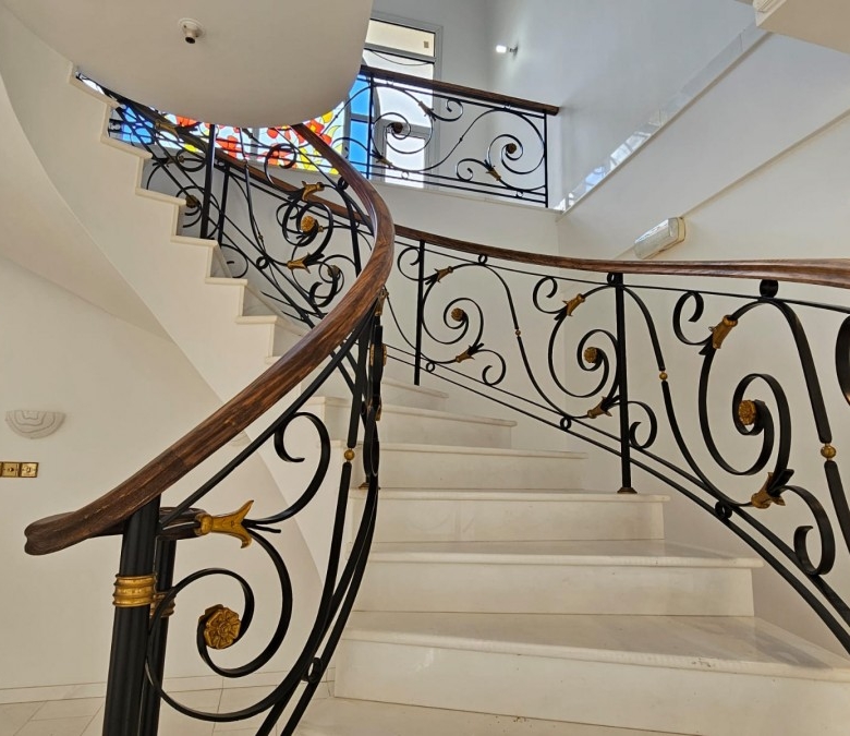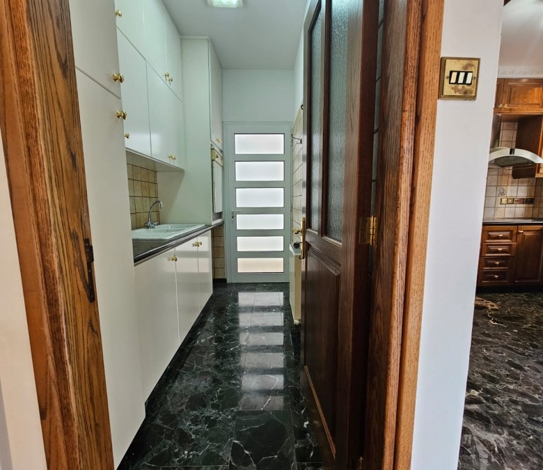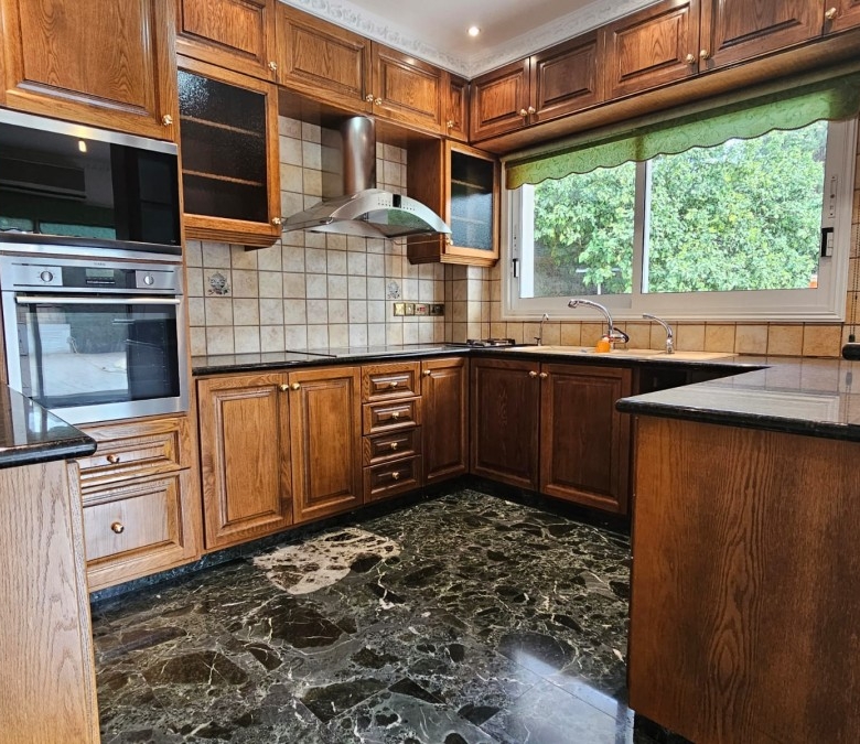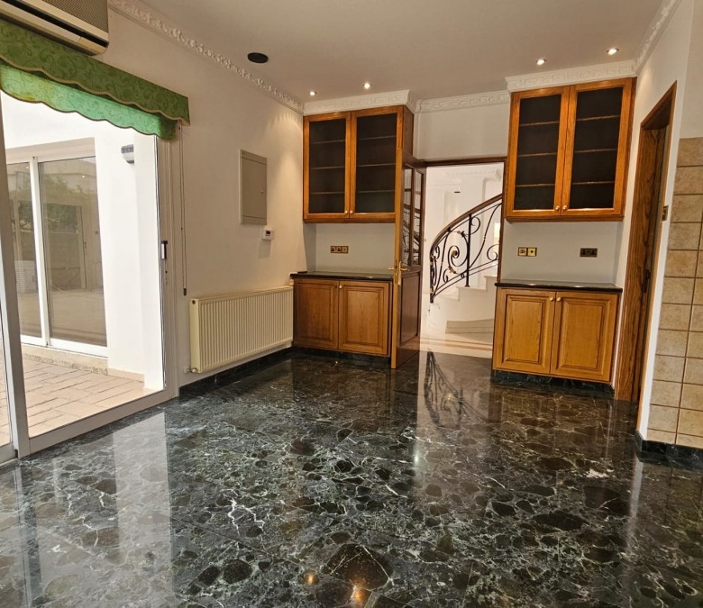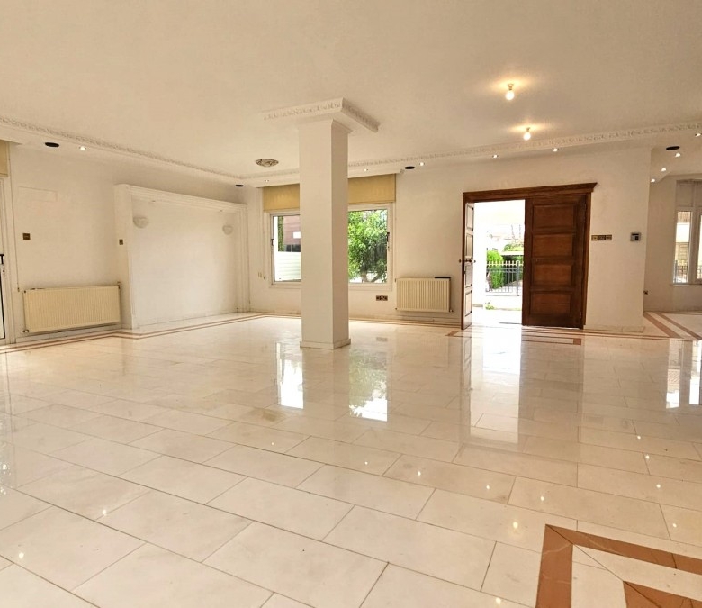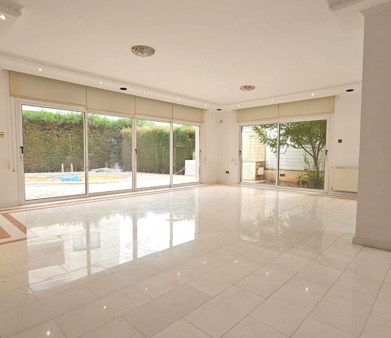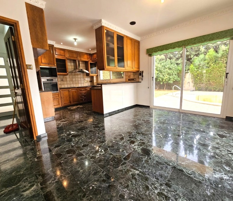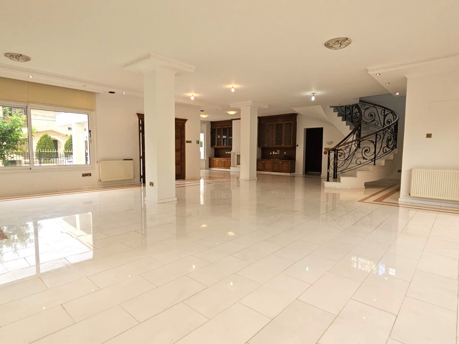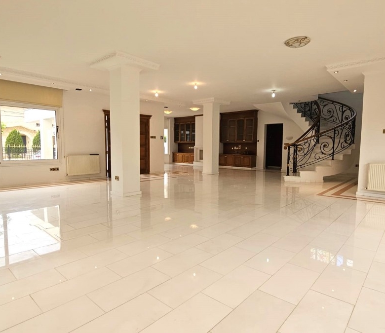 Exclusive 5-bedroom villa located in a very quiet and prime area of Potamos Germasogias. The Villa sits on a huge plot of 746 sqm and has a total of 435 sqm covered areas. On the ground floor, as you enter the double entry doors, you are treated to a vast open living/dining/sitting area. The characteristic of this space is the shiny marble floor made from Thasou marble, a cozy fireplace, and glass doors offering a beautiful view of the garden and pool. There is also a guest WC, a separate kitchen, and a kitchenette. On the first floor, you will find four large bedrooms (one of which is the master room and has its own en-suite bath and WC and also a balcony facing the pool). New parquet flooring has been installed in all 4 rooms. There is also, a family bathroom with a jacuzzi and shower and also a small kitchenette. From this floor, there is a wooden spiral staircase leading up to the enormous loft bedroom which is the size of a small apartment. This bedroom has its own en-suite bath and WC and a storage room. Outdoor features include double electric front gates, a garage for 2 cars with electric doors, a back garden with a pool, and an irrigation system. Separate from the main house there is a self-contained room with its own wardrobe, shower, and WC.An additional feature that adds value to the property is that the walls are built with double brick with polystyrene in between.