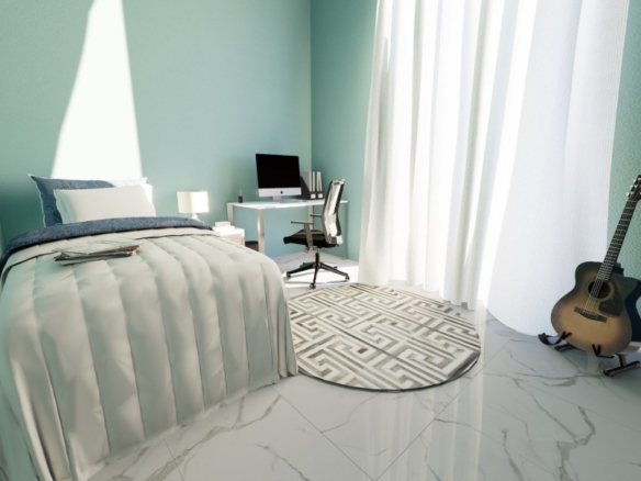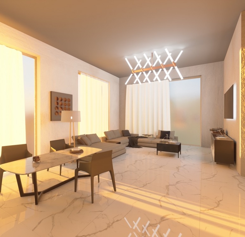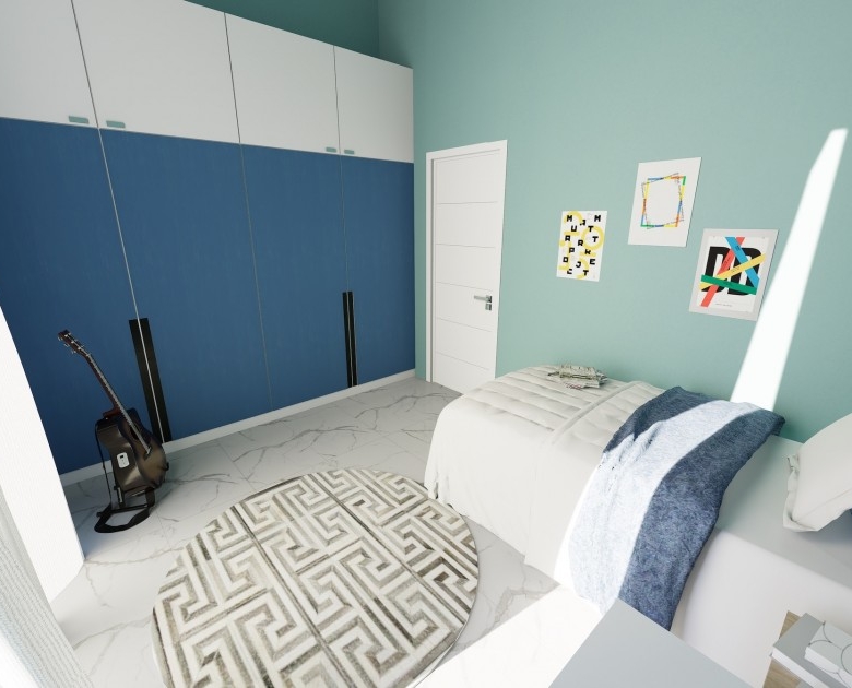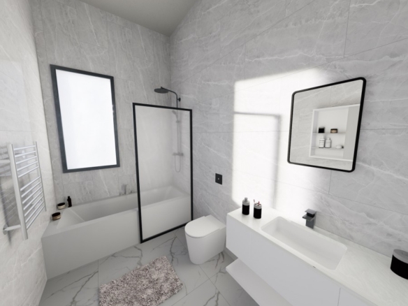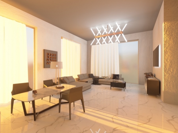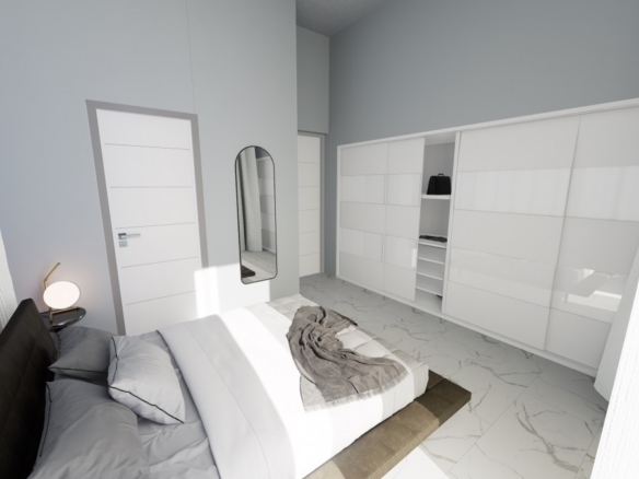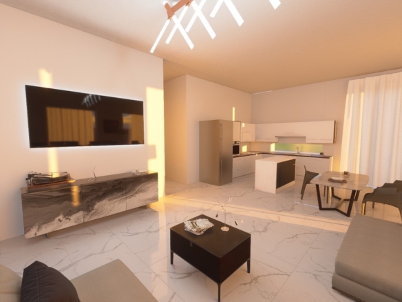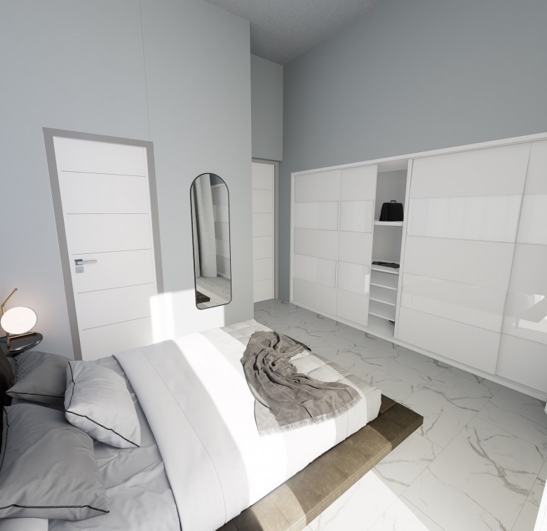 The bungalow features the same open plan layout spanning a single floor. There are 3 bedrooms with 1 bigger bedroom en-suite, two smaller ones for the kids. The biggest room is the combined kitchen-living room, approx. of 50 sq. m. The kitchen boasts an island and a space for a big table for 8 (not included). The living area will have enough space for two sofas and a huge TV (both not included). Both areas have windows all around, including a cooking area. Included in the price: kitchen and wardrobes, as well as heated floors and photovoltaics.