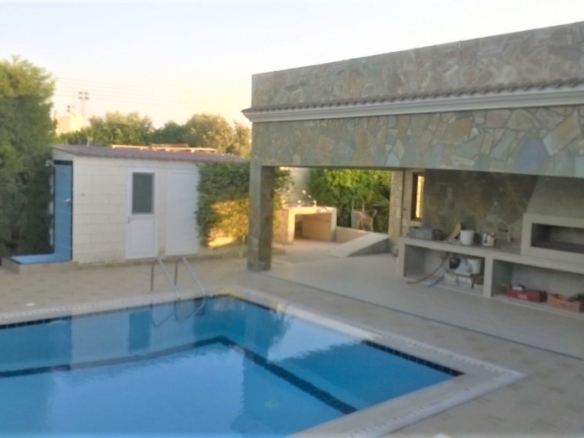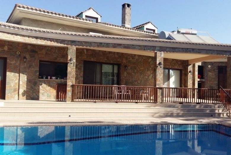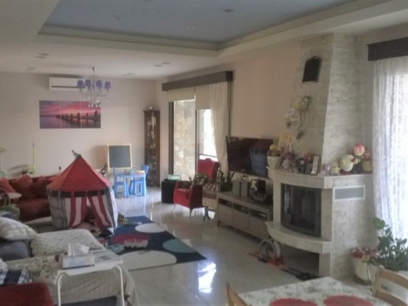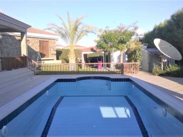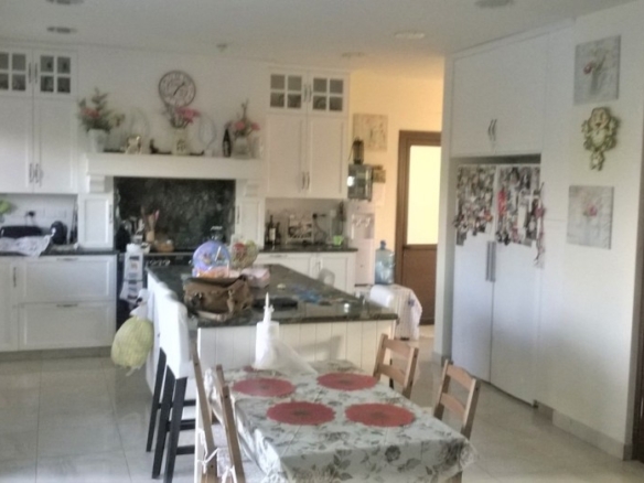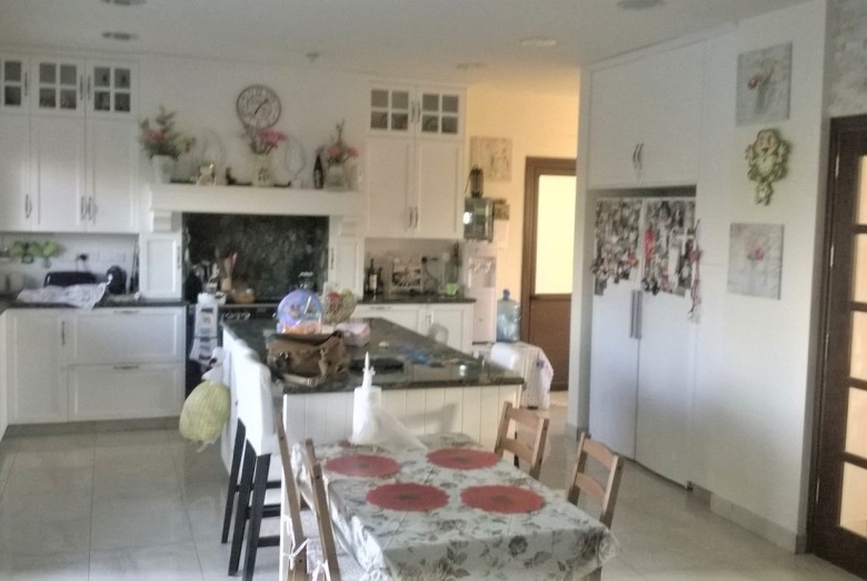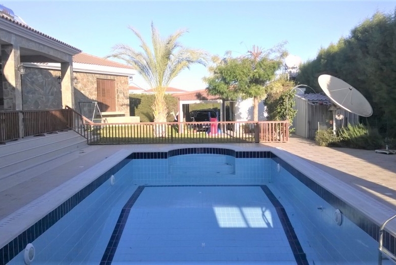 A 4 bedroom detached house for sale in Dali, Nicosia with an extra room which is currently being used as an office. It is located only a 15 min drive from the town of Nicosia, 20-30 min drive from Larnaca, 40 min drive from Ay. Napa and a 40 min drive from Limassol. There is a private swimming pool with shower, changing room, barbecue area, dog house and WC outside. There is also a big attic of 70sqm approximately with storage room, shower and WC while the rest of the space could be used as a playroom, cinema or gym. The house consists of one big dining room, two living rooms which are open plan to a French styled kitchen and extra laundry room. There is one big bathroom and guest WC, big walking closet, a/c units in all of the rooms, floor heating (petrol), solar panels, 3 glaze windows, covered/uncovered and garage parking and mature gardens with fruit trees. Another plus is that there is space to build another house, tennis court, offices, swimming pool or even gas station.