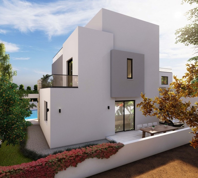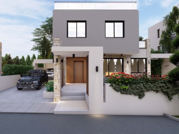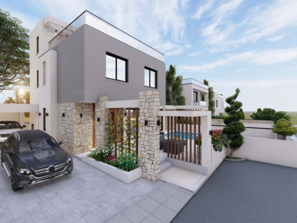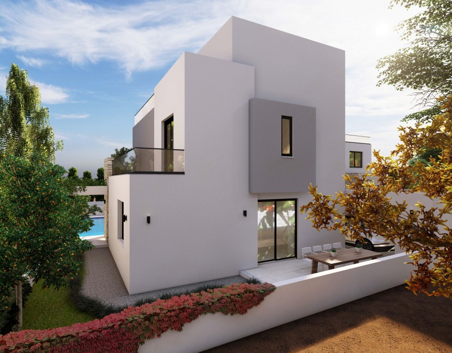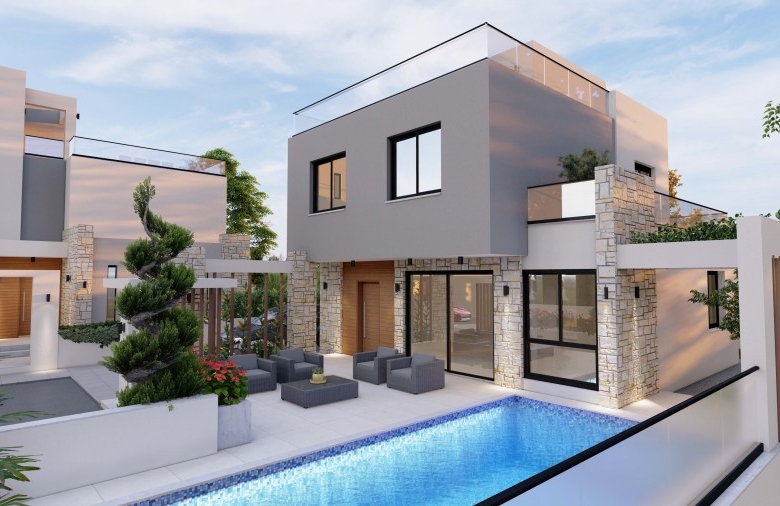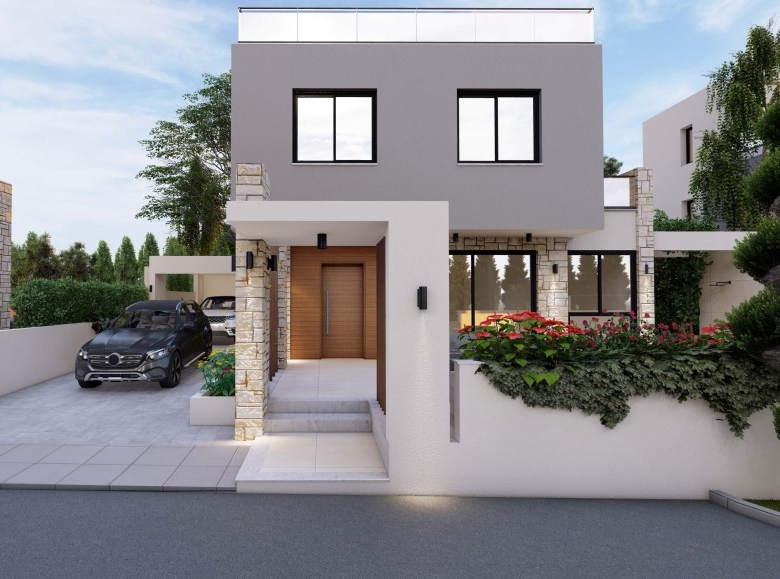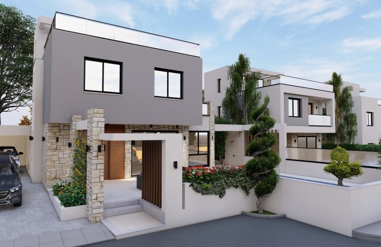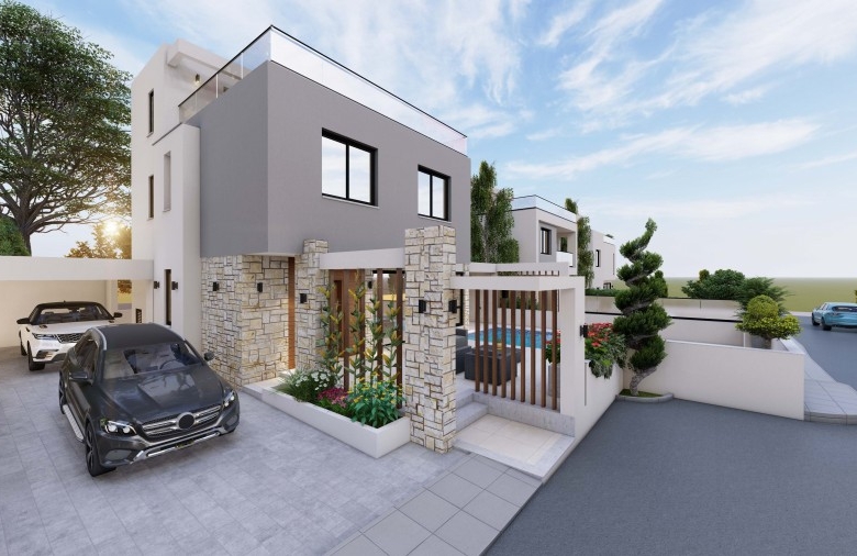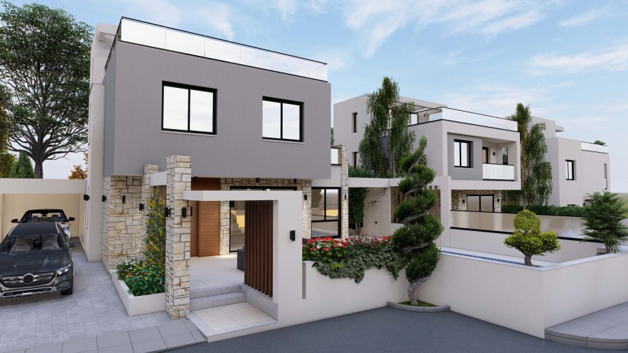 Spectacular villa with 5 bedrooms plus 1 room on the Roof Terrace, 4 bathrooms and a swimming pool in a quiet area, Chloraka.Entering the house you find a gorgeous open-plan setup, hosting a spacious living room that’s near the beautiful U-shaped kitchen with quartz counters with the dining area right next to it, worth mentioning is that the kitchen, living room and dining area enjoy big windows that bring in lots of light and offer outside views . Moving on to the staircase you find a neatly placed toilet room beneath it that serves the ground floor. Finally reaching the 1st floor you find all 3 bedrooms, with the master bedroom enjoying its own en-suite bathroom with another communal bathroom that serves the rest of the bedrooms. The villa features high quality specifications and finishes such as exterior natural stone cladding, marble staircase, quartz kitchen counters, aluminum & glass railings and much more. Roof garden terrace area of 49 square meters. Delivery – 8 months.
