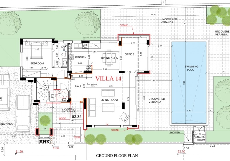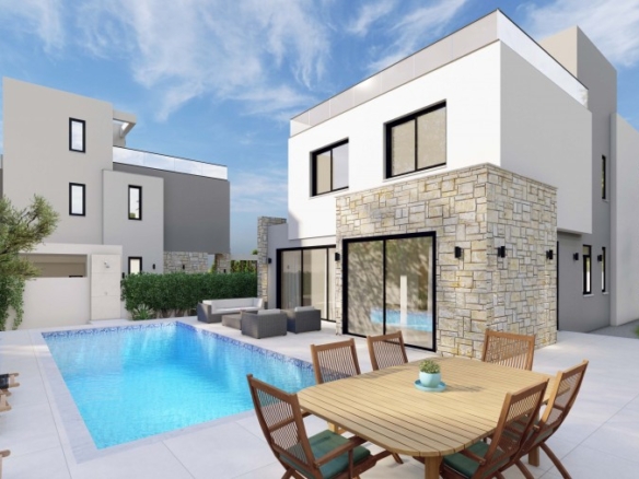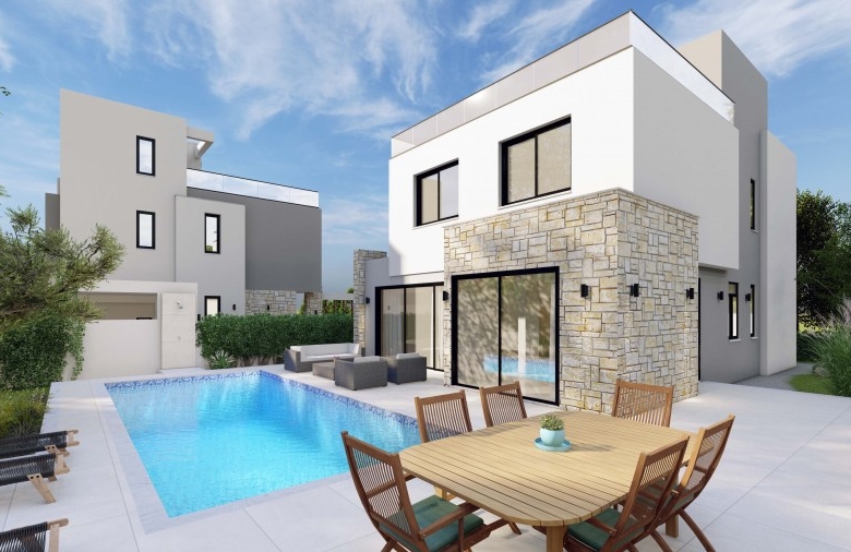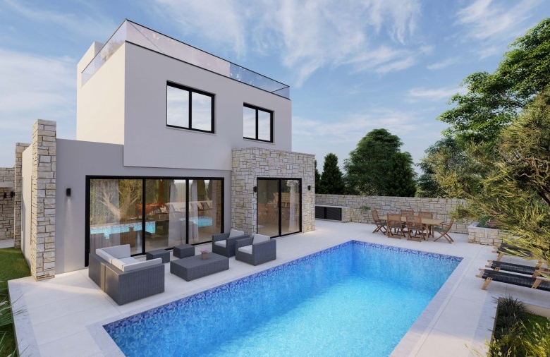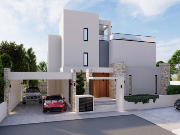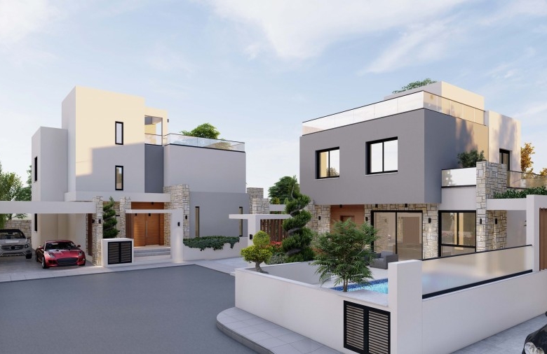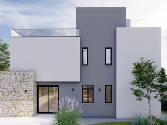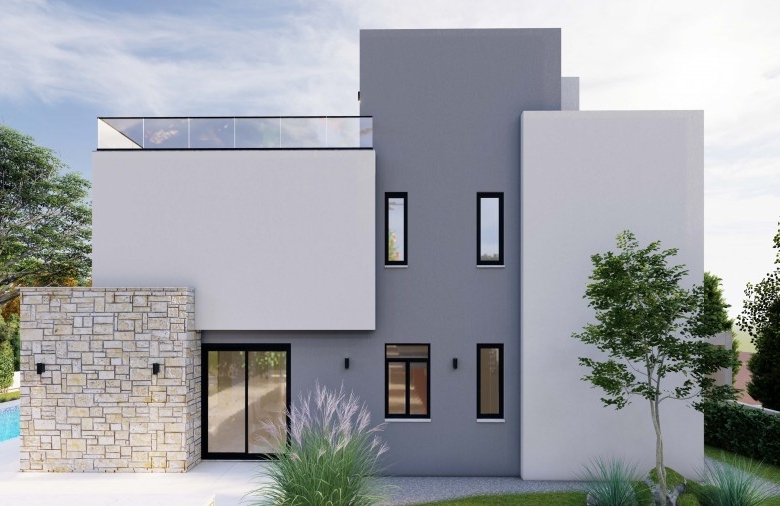 Spectacular villa with 3 bedrooms plus 1 room on the Roof Terrace, 3.5 bathrooms and a swimming pool in a quiet area, Chloraka.Entering the house you find a gorgeous open-plan setup, hosting a spacious living room that’s near the beautiful U-shaped kitchen with quartz counters with the dining area right next to it, worth mentioning is that the kitchen, living room and dining area enjoy big windows that bring in lots of light and offer outside views . Moving on to the staircase you find a neatly placed toilet room beneath it that serves the ground floor. Finally reaching the 1st floor you find all 3 bedrooms, with the master bedroom enjoying its own en-suite bathroom with another communal bathroom that serves the rest of the bedrooms. The villa features high quality specifications and finishes such as exterior natural stone cladding, marble staircase, quartz kitchen counters, aluminum & glass railings and much more. Roof garden terrace area of 49 square meters. Delivery – 8 months.