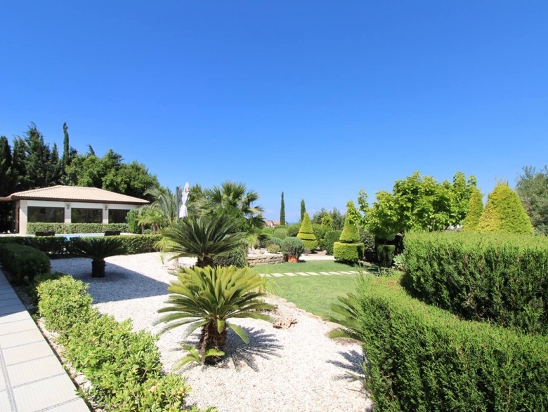 This fantastic villa is located on the Western Plateau, within walking distance to the village square facilities and offers complete privacy and peace of mind. Upon entering the villa, one will notice the harmonious colours that blend from the flooring and wall finishes to the very high-end Italian Design Kitchen cupboards. The lounge area offers a very high wooden beam ceiling and a large fireplace for those warm cosy evenings during the winter period. A second lounge can be found for everyday living with fantastic views over the large swimming pool and towards the magnificently designed gardens of the villa. The property offers 4 spacious bedrooms and 4 bathrooms with a fifth room that has been converted into an office but can be utilized as a smaller bedroom. The dining area can be located right next to the superbly designed kitchen which has been fitted with modern name brand appliances. Upon exiting the villa, one will notice a detached entertainment room to the left of the large swimming pool, offering a full size billiards table and plenty space for one to include a bar for those who want to socialise with the full experience of a sports bar. To the right of the swimming pool on the very edge of the garden, one may enjoy complete serenity with their own private jacuzzi, with amazing views over the golf course below and towards the Blue Mediterranean Sea. What makes this beautiful villa stand out, is its very spacious gardens, that have been designed to the very highest standards, offering unique colourful plants and shrubs with mature trees that have been trimmed and shaped to catch the eye. Truly one of the most beautiful gardens one can experience on the resort.Aphrodite Hills is a coastal resort in the Paphos district, Cyprus. It is named after the goddess Aphrodite and the resort is only one mile away from Aphrodite’s Rock. The resort is built on two elevated plateaus divided by a natural ravine. The resort has many features of a Mediterranean town. Greco-Roman architecture dominates, locally quarried stone is used in buildings and the town square has a market, restaurants, souvenir shops, a chapel, fragrant gardens, splashing fountains and an art gallery. The resort also has a spa, golf course, and leisure facilities. Aphrodite Hills has received two international listings in 2010. The Intercontinental Aphrodite Hills Resort Hotel and The Retreat spa were both listed in Conde Nast Travellers’ Gold Lists for 2010. The Retreat Spa was named third best Hotel Spa in Europe, Asia Minor and the Russian Federation, at the Condé Nast Traveller Readers’ Spa Awards and was also listed in the publication’s 2010 Gold List for the Best Spas