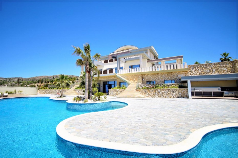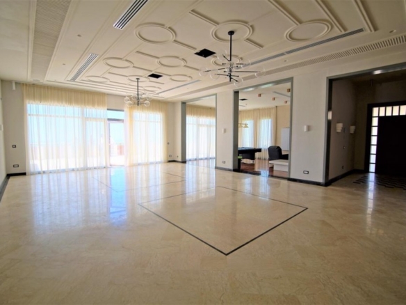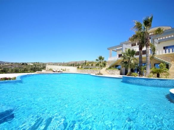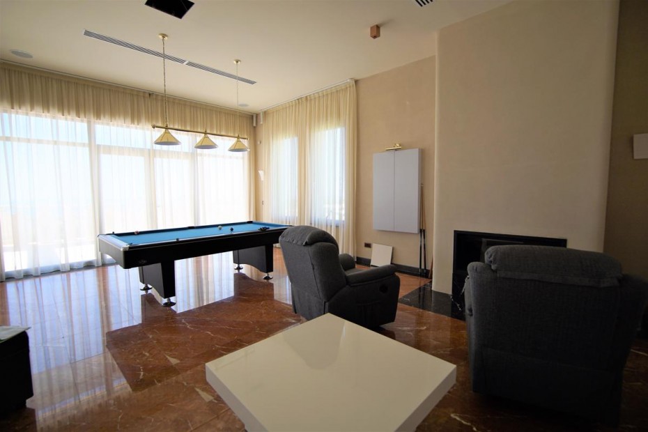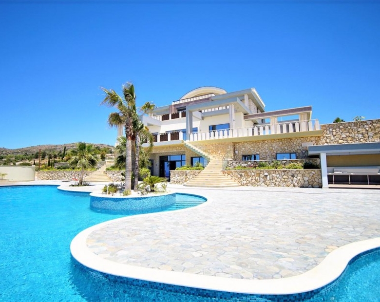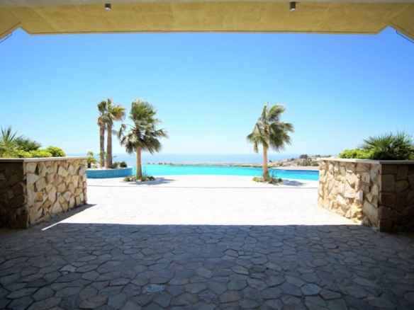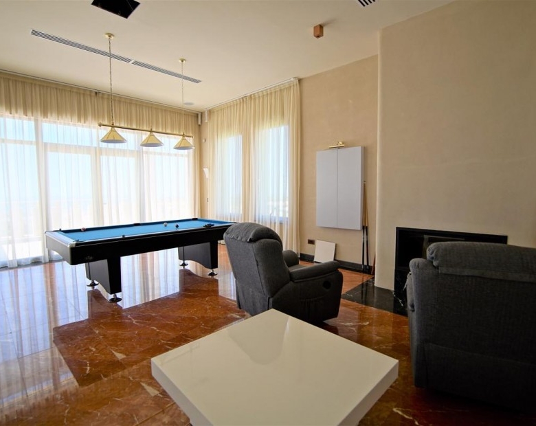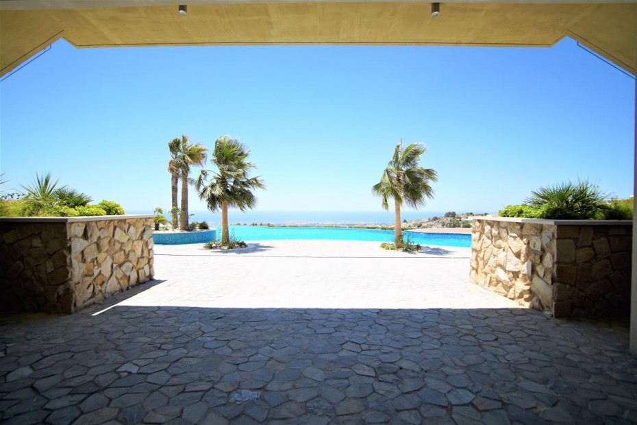 Luxury villa with a fantastic panorama of the sea and the city is located in the mountainous part of the suburbs of Paphos, only 5 5-minute drive to the International School of Paphos. Exceptional property with 260-degree views of the coastline of Paphos. Property consist of 8 bedrooms, cinema room, games room spa area with sauna, shower and lounge and massage room, gym, Billiard – mantel, wine cellar, 2 kitchens, Pati Hall with bar (100 m.sq.), Solarium with Jacuzzi, Garage on 3 a/m, parking zones for 20 a/m, rotunda in the walking area, solar collectors. Pool 560 litres (30m X 15m) with salt water, overflow, and massage beds.Must-see property.