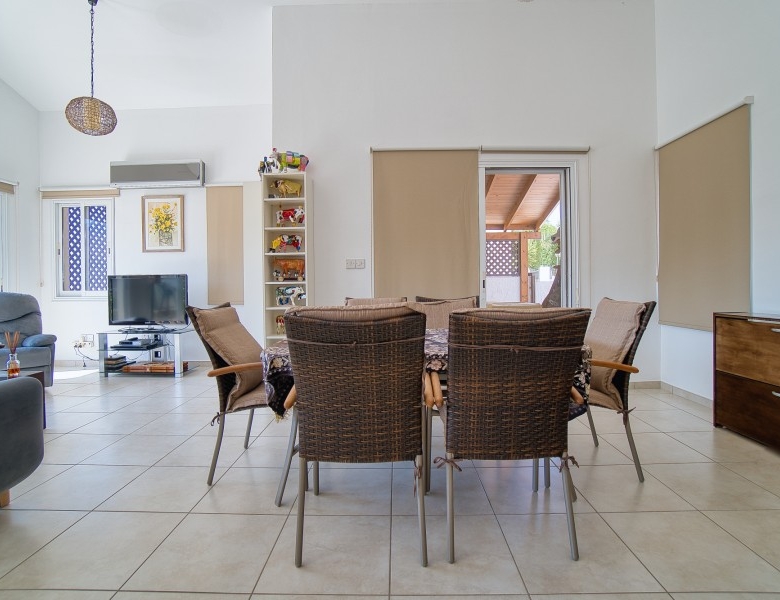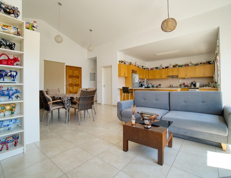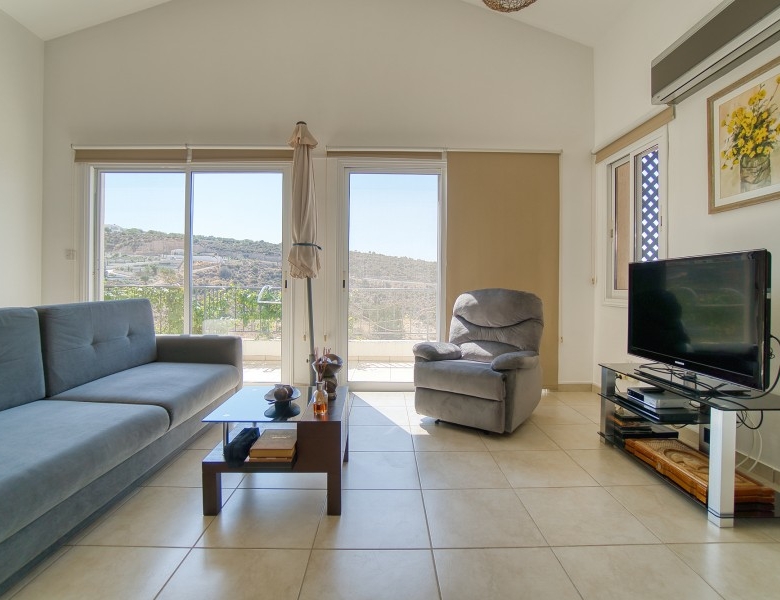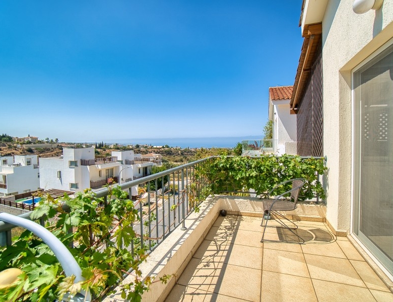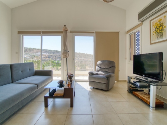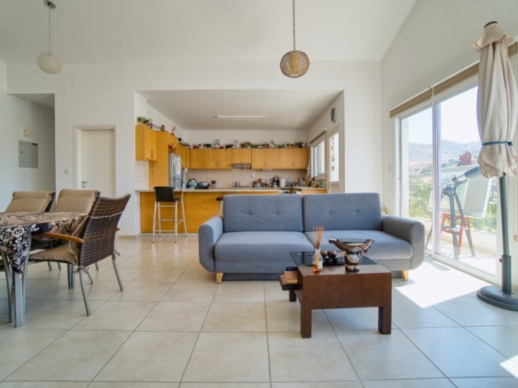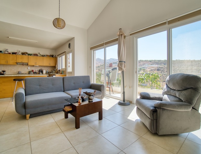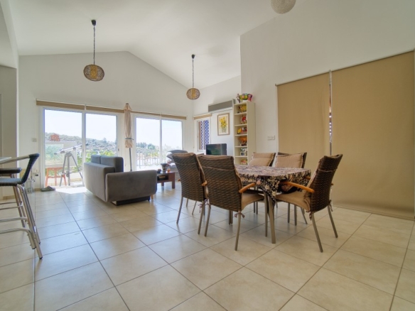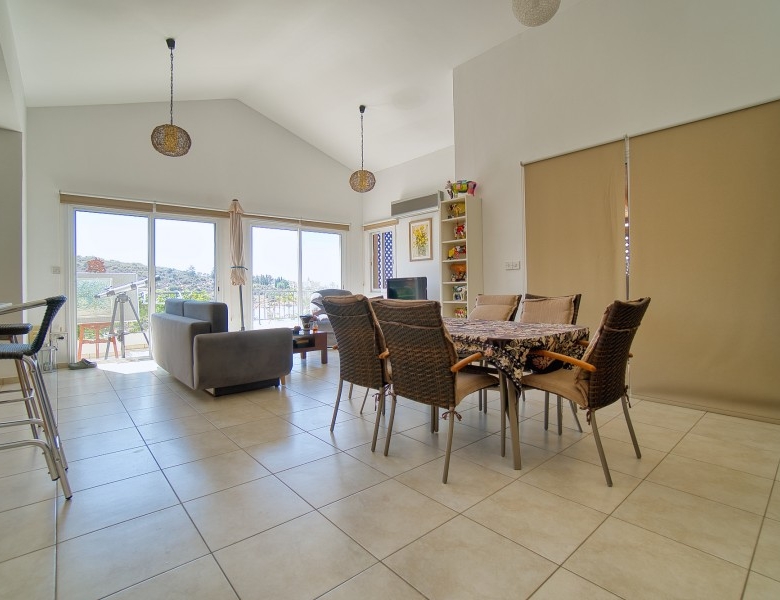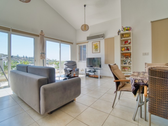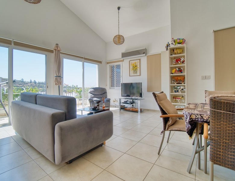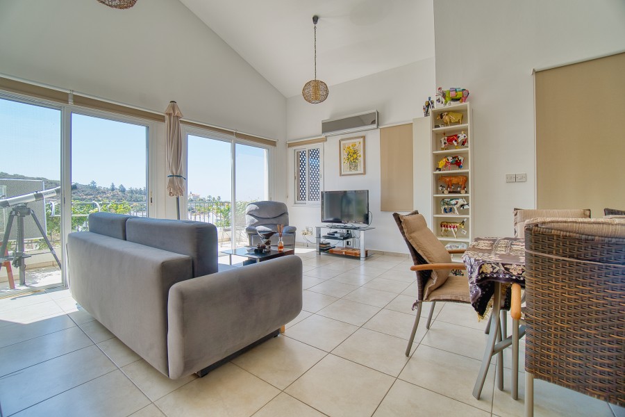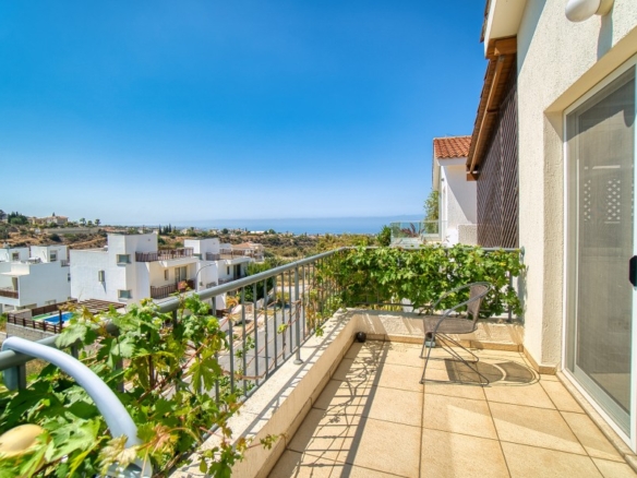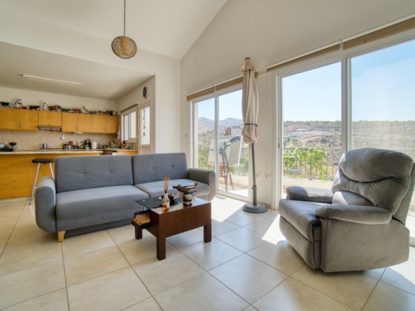 Lovely 3 Bedroom Semi Detached Villa for sale in Peyia Village. This is an upside down house. Entering the property on the first floor with a spacious open plan living/dinning/kitchen with breakfast bar, guest toilet and access to balconies and the parking space. Internal stairs leading down to the 3 double bedrooms with the master having an en suite shower and the other two sharing the family bathroom. The property offers private covered parking, well maintained mature gardens with fruit trees and lovely sea and mountain views from the balconies. Externally there is an extra large closed room which can be converted into an extra separate studio apartment or can be used as a gym or storage area.Features: Air conditioning, granite worktops, double glazing, fly screens, water pressure system, private covered parking. Property is sold fully furnished and with full title deeds.