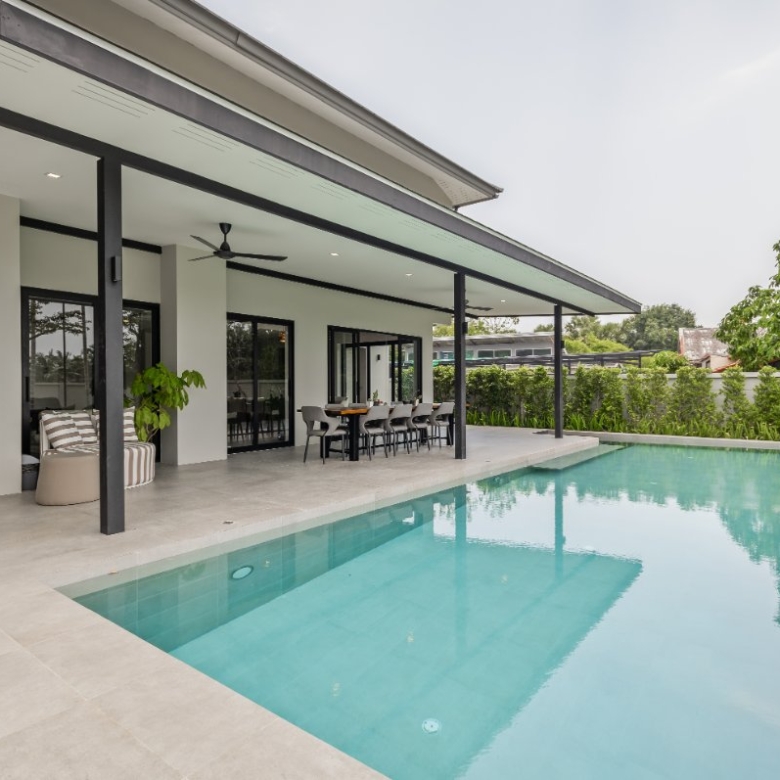 Villa Jinny – Fully Renovated 4-Bedroom Private Villa in Paklok, East Phuket Experience the perfect fusion of modern elegance and tropical tranquility with Villa Jinny, a fully renovated 4-bedroom private villa situated in the serene Paklok area on Phuket’s east coast. This double-story residence offers 339 m² of refined indoor living space complemented by 147 m² of outdoor areas, all set within a generous 1,332 m² land plot. Key Features: Spacious Bedrooms: Four generously sized bedrooms, each with ensuite bathrooms. The villa includes two luxurious master suites featuring walk-in closets and spa-like bathrooms with bathtubs and rain showers. Modern Living Spaces: An open-plan living and dining area seamlessly connects to a fully equipped Western kitchen, leading out to the pool and garden areas. Outdoor Oasis: Enjoy a 12-meter saltwater pool accompanied by a 60 m² covered terrace, ideal for alfresco dining and entertaining. The expansive garden offers ample space for children to play or the potential to develop private sports facilities. Additional Amenities: A flexible staff room with an ensuite bathroom can serve as an office or guest quarters. The property also features a double carport, electric gate, and a well-lit entrance for enhanced privacy and security. Ideal Location: Villa Jinny is strategically located for both convenience and lifestyle, offering easy access to Phuket’s premier amenities: 6 minutes to Yamu Pier 7 minutes to COMO Point Yamu Resort 8 minutes to Ao Por Marina 10 minutes to Finnway International School 20 minutes to UWC and BISP International Schools 30 minutes to Phuket International Airport Investment Potential: With its recent comprehensive renovation completed in February 2025, Villa Jinny is move-in ready and presents a compelling investment opportunity. The property’s expansive land plot allows for future expansion, whether for a guest cottage, home office, or additional villa. Its proximity to international schools, marinas, and luxury resorts enhances its appeal for both long-term residence and rental prospects. For more information or to schedule a private viewing, please contact us at ThaiEstate.