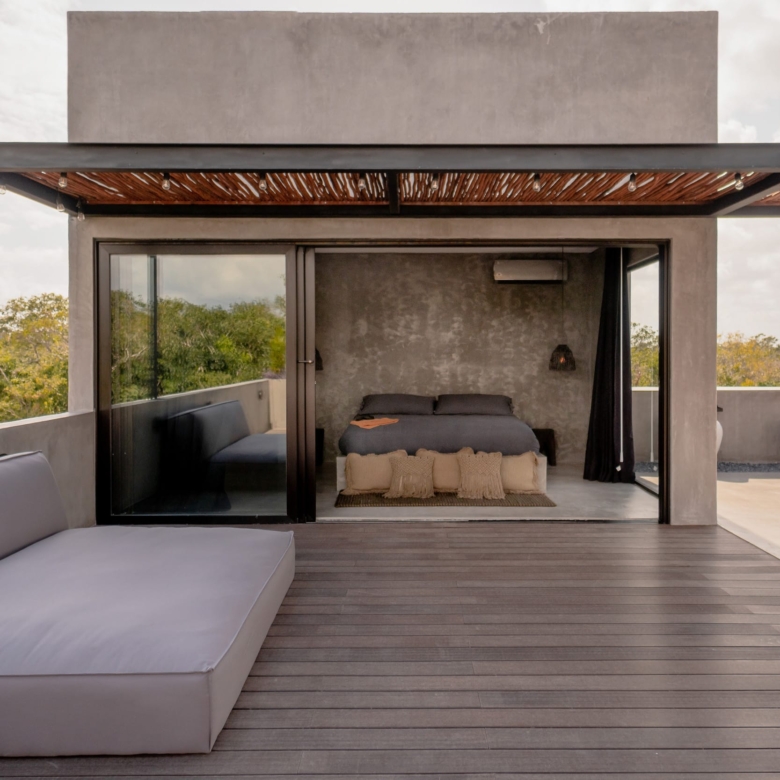 One of the most extraordinary features of Villa Niburu is its expansive rooftop terrace, which provides breathtaking views of the lush Mayan jungle. This private sanctuary includes a second swimming pool, comfortable lounge seating, and a shaded pergola, making it the perfect place to unwind while enjoying the beauty of Tulum. Whether soaking in the rooftop pool or relaxing under the stars, this space offers an unparalleled ambiance of luxury and exclusivity.