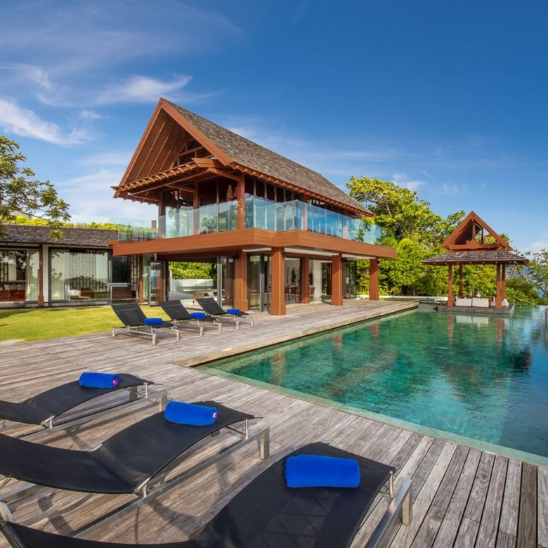Villa Santisuk is a beautiful, five bedroomed contemporary styled villa with clear Asian influence, situated at the top of a private oceanfront estate facing west towards the open ocean with amazing 360 degree and sunset views over the Andaman Sea. Highlights 360-degree, ocean, mountain and sunset views 5 private, spacious bedrooms all with majestic sea views The villa was designed to emphasize peace and tranquility Numerous private areas for guests and relaxing water features Secluded and safe with no road noise, yet only 10 minutes from Patong and other beach Resorts. The Villa The villa is designed so that it’s twin-level main living areas form a focus beside the 20m long infinity-edge swimming pool. Key to the design concept is that off from the main living pavilion there are many private areas to allow guests to disperse or join one another in different areas, shaded, or open. The blending of the indoors with the outdoors is achieved by use of extensive folding, sliding doors to create seamless transitioning from inside the villa spaces to the outside. High 3m+ ceilings and generous room sizes project the luxury of space even within the intimate and private bedroom areas. Extensive water features from the impressive entrance walkway to the ‘in water’ sala area at the southern end of the pool, to the outdoor spa showers in the bathroom areas several with cascading waterwalls promote a sense of tranquility and give the villa its name; ‘Santisuk’ The villa sits secure and private atop the estate with a statement entrance ‘walk’ alongside reflection ponds, which emphasize guest’s sense of arrival and bring one to the main living level. There expansive, integrated hard surface, grass, pool and pool deck areas give the villa it’s scale and central focus and provides ample space for entertaining and receptions. Dining Overlooking this area is the villa’s signature, two storey pavilion with formal dining, lounge area and side bar kitchen on the ground floor level with a second living area above. High quality anodized aluminum folding sliding windows allow these spaces to be opened up to the wonderful sea and mountain side views beyond. The pavilion is cloaked in well maintained wood which with the modern glazing provides an appealing fusion of the traditional with the modern. The living area pavilion also looks out and down over the 20m long Indonesian stone infinity pool with ‘floating’ relaxing sala at the southern end for massages, reading, dining etc. There are five spacious, sea-view bedrooms with indoor and outdoor bathrooms and plenty of closet space. To the rear side of the main villa level looking westwards across the lawns and pool to the sea, are two large guest bedrooms, 2 and 3 with high ceilings, wooden floors and bathrooms each with an external private garden area with waterfall and second , outside shower. Master On the northern side of the pool level is the master bedroom suite. It’s forward position provides a high level of privacy, while the three sided floor to ceiling folding/ sliding windows maximize views of the surrounding hills and sea. Once again, this bedroom enjoys huge space, high ceilings, an integrated work desk behind the bed, and both indoor and outdoor shower facilities. Down a stairway is access to bedroom 4 and 5. Each have strong sea-views and spacious terraces/ balconies. Bedroom 5 has an ocean-view bath in addition to shower. Behind bedroom 4 is a home theatre/ TV room with additional storage room. At the rear of the main living level stairs lead down to a large kitchen and pantry. Further stairs lead to a spacious well-lit and airy gym and then on to two maids’ rooms. At the rear of the villa is a walkway to a mountain facing sala for guests to read and relax away from the main villa. The villa was completed in around 2005. It has been well maintained and underwent a redecoration in 2022. The Estate The property is within the secure and well-maintained Samsara estate, set within a community of other luxury properties. There is beach access down the from the headland to either Blue Coral Beach below the Naka Hotel or on the eastern side of the headland to the beach in front of the Tavorn Hotel. Patong and Kamala are 10 minutes by car. The sales price is $7.4M USD, any advertised Thai Baht price is an estimated value of the USD amount based on the exchange rate at that time.