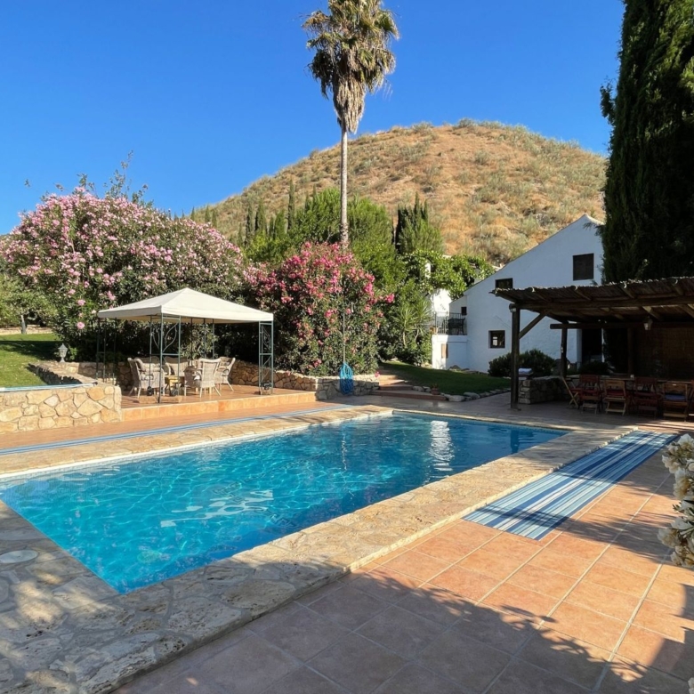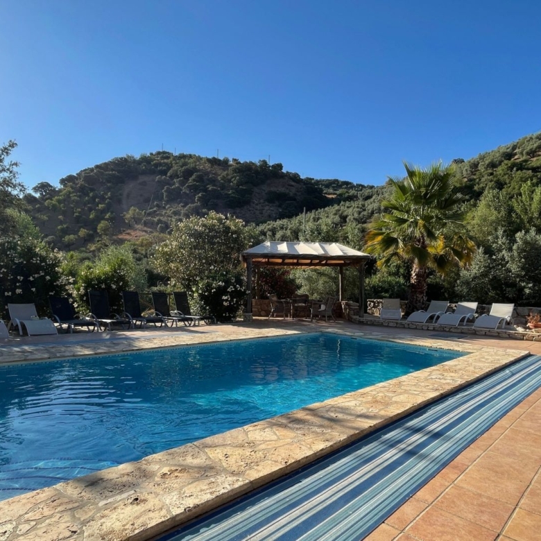 A beautiful large white Andalucian mill house, currently used for holiday rentals, with 10 bedrooms, 7 bathrooms, and private swimming pool, set in large, secluded gardens. It is a fantastic property that has everything to offer and more! The house is surrounded by hills and olive groves near the lovely Lake Iznajar and with excellent access to the vibrant cities of southern Spain: Granada, Seville, Cordoba, Ronda and Malaga. This unique and beautiful Andalucian Cortijo was a working water mill and bakery until the end of the 20th century, supplying bread to local farms and villages. The Old Bakery kitchen still features the original bread oven, but now has a restaurant grade cooker and a dishwasher too. In the grounds, you will find fresh herbs from the kitchen garden, pomegranate, fig, peach, and almond trees, sunny terraces, and a floodlit sports court, ideal for tennis, volleyball, or badminton. There is also a studio for indoor cinema (with projector and screen), yoga and Pilates and there is a Petanque Pista (the Spanish version of Boules), ping pong table, sandpit and of course a lovely private swimming pool. The exterior also boasts shaded dining areas, picnic spots next to the stream, a vine-covered courtyard, and big private gardens where children can run around safely. The land is flat and would be ideal for horses. Lovingly restored to retain all the character of the big old mill house, the accommodation is arranged into two wings around a central courtyard. The eastern wing of the house is renovated from the old mill, retaining its original features, with the main kitchen, living and dining rooms together with 5/6 bedrooms and 4 bathrooms. The other wing was formerly the house of the master baker and has 4 bedrooms, 3 bathrooms and a second kitchen. This stunning property offers the option of having breakfast on the kitchen terrace (watching the antics of the ducks and listening to the hens laying your morning eggs), lunch in the vine-shaded courtyard, or ramble down to the stream with the children for a picnic tea and enjoy dinner by the pool in the evening. If you prefer to entertain guests indoors the dining room can seat up to 18 people and you can easily spread out into the adjacent Old Bakery kitchen which seats a further 10 guests. Property ID: ICPF4253290 Price: €745,000 Property Size: 574 m2 Land Area: 6262 m2 Bedrooms: 10 Bathrooms: 7 Property Type: Country house Property Status: For Sale